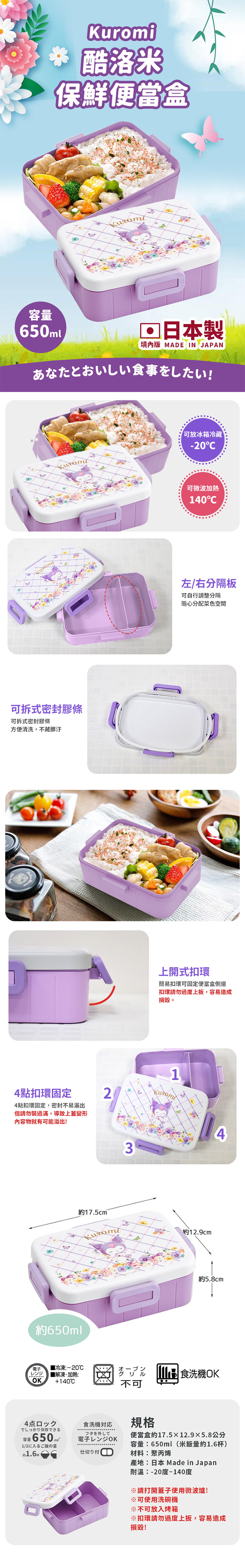 ●日本製 境內版●外出旅行、野餐出遊適用●內含左右分隔板(可自行分隔)●可耐溫140度,可微波 不可進烤箱●4點扣點固定