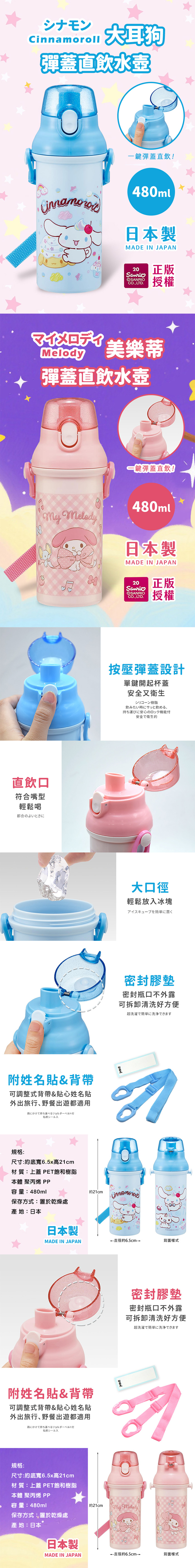 ●日本製 正版授權●不含雙酚A●超輕量彈蓋直飲隨身壺●外出旅行、野餐出遊適用●按壓彈蓋直飲式 寬口徑好放冰塊●附姓名貼紙、可拆式斜揹帶