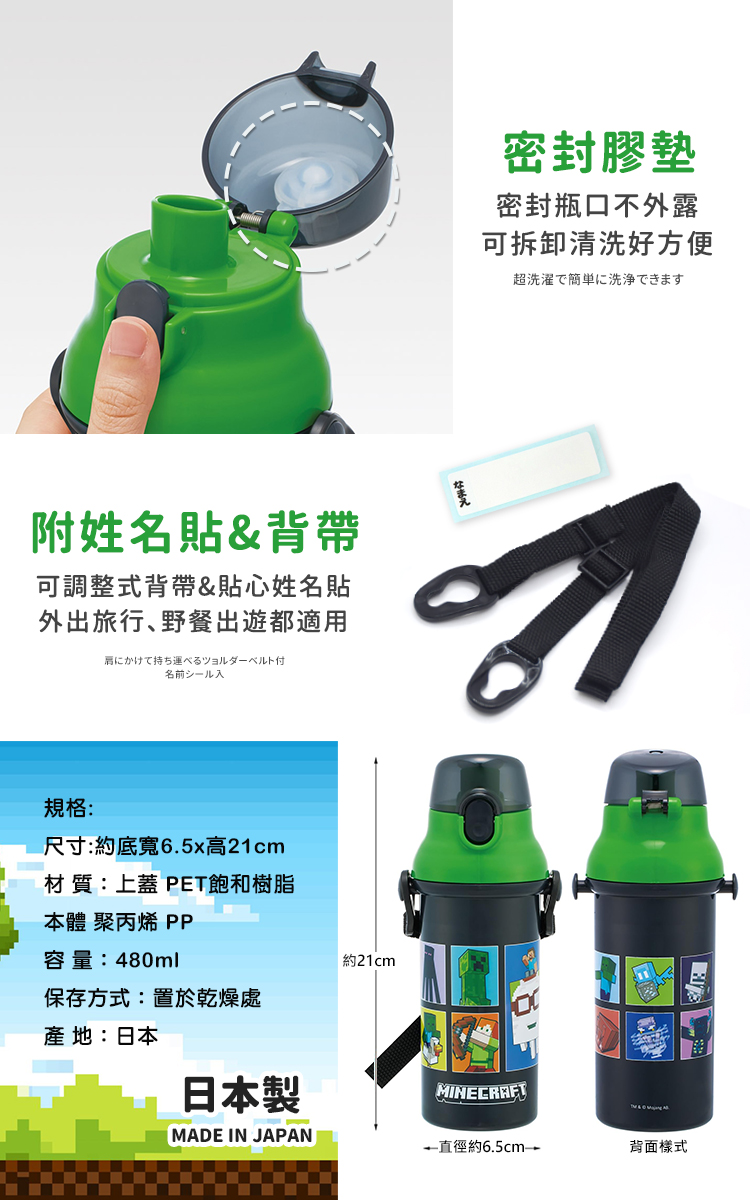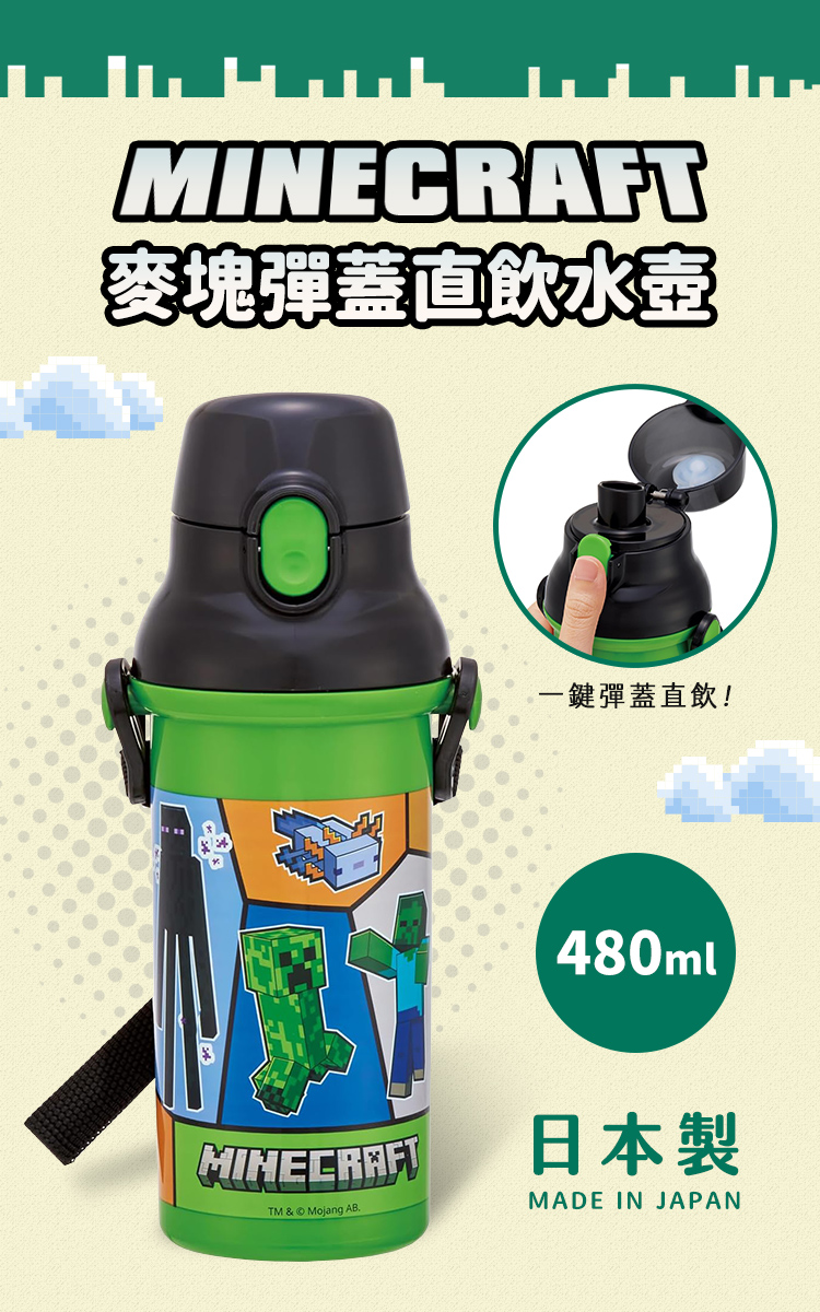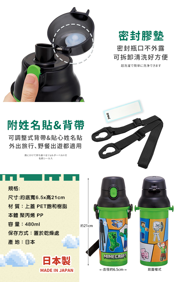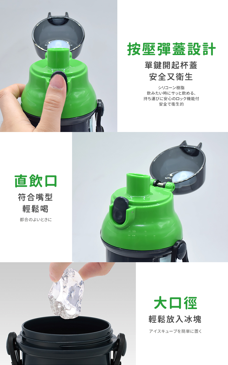 ●日本製 正版授權●不含雙酚A●超輕量彈蓋直飲隨身壺●外出旅行、野餐出遊適用●按壓彈蓋直飲式 寬口徑好放冰塊●附姓名貼紙、可拆式斜揹帶
