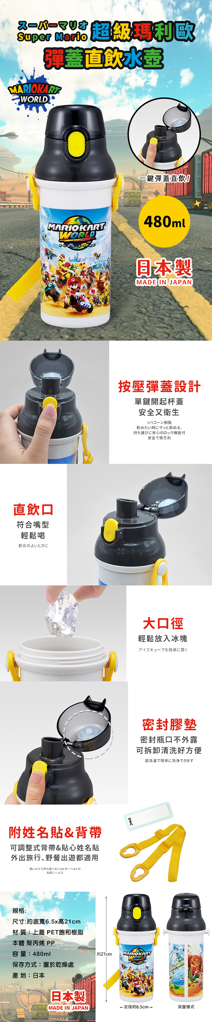 ●日本製 正版授權●不含雙酚A●超輕量彈蓋直飲隨身壺●外出旅行、野餐出遊適用●按壓彈蓋直飲式 寬口徑好放冰塊●附姓名貼紙、可拆式斜揹帶
