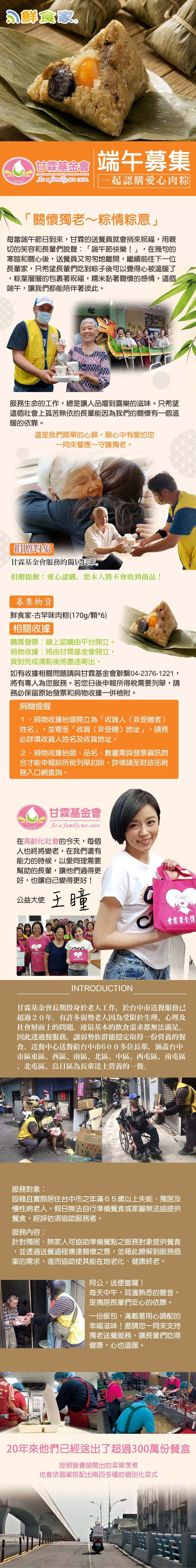 商品規格商品名稱:甘霖基金會x鮮食家古早味香菇蛋黃鮮肉粽(170gx6顆/包)(購買者本人不會收到商品)規格:170g±5%/顆x6顆/包成份:長糯米、香菇、、鴨蛋黃、滷肉、花生、油蔥酥、蝦皮、醬油、鹽、糖、麻油、味精(、L-麩酸鈉)、沙茶粉(蔥乾、芝麻、椰子粉、薑粉、胡椒、蒜頭、赤尾青、鹽、胡荽、肉桂、茴香)、柴魚高湯粉(食鹽、糊精、玉米澱粉、砂糖、乾燻鰹魚粉、高麗菜、醬油、葡萄糖、鰹魚抽取物、水解大豆蛋白、玉米糖膠、鯷魚醬、酵母抽取、碳酸鉀、甜味劑(D-甘露醇)、L-麩酸鈉)保存期限:180產地:台灣葷素標示:葷保存方式:冷凍過敏原資訊:本產品含花生製品、蛋製品、蝦製品建議食用方式:參照說明先解凍再蒸熱食用