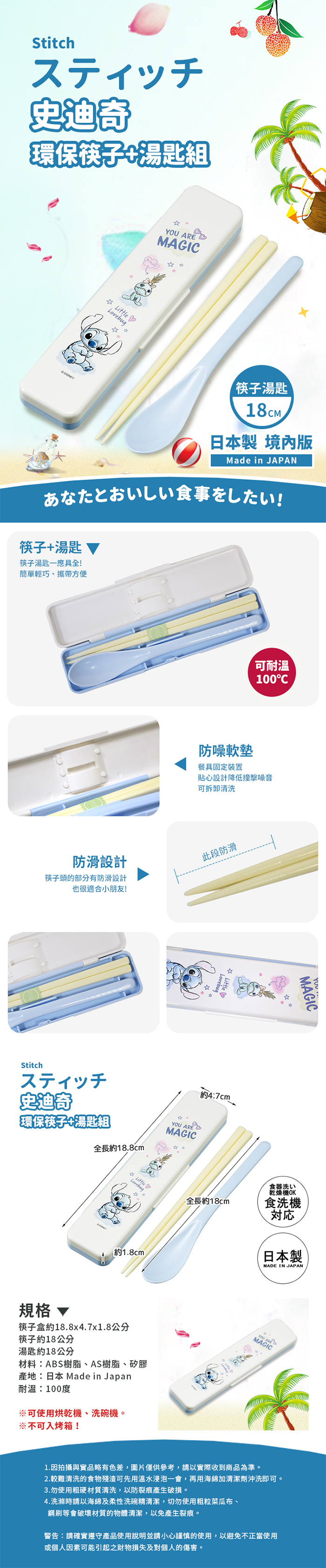 品牌:日本SKATER原廠公司貨-平行輸入包裝尺寸約19x5x2公分筷子盒約18.8x4.7x1.8公分筷子約18公分湯匙約18公分材料:ABS樹脂、AS樹脂、矽膠重量:約66g(含包裝)(手量誤差±5%)產地:日本 Made in Japan耐溫:100度