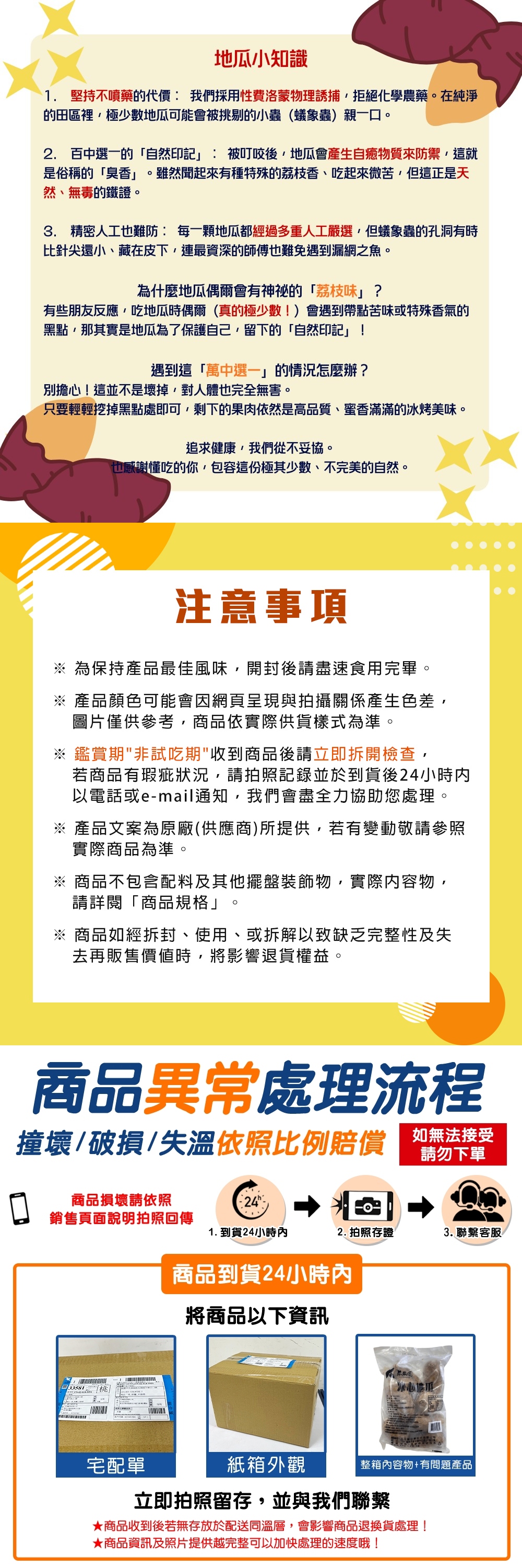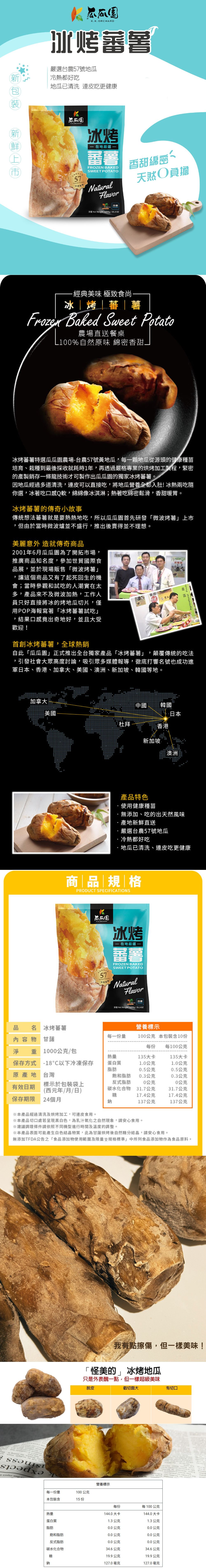 商品內容商品組合/規格:冰烤蕃薯1kg/包+NG冰烤地瓜1.5kg/包商品品名:冰烤蕃薯+NG冰烤地瓜1+1包商品重(容)量:1000g/包+1500g/包內容物成分(如含有豬、牛成分請加註國別):甘藷過敏原資訊:無食品添加物名稱:無原產地(國):台灣保存期限:24個月保存方式:-18℃以下冷凍保存食用方式:1.冷食:稍解凍後約30分鐘,即可冰冰涼涼的吃,別具風味。2.熱食:居家微波無需解凍,直接微波3分鐘後即可食用。若使用烤箱加熱時,務必將蕃薯完全解凍後再放入加熱4至6分鐘即可。注意事項:※甘藷經過清洗及烘烤加工,可連皮食用。※甘藷切口處若呈現黑白色,為乳汁氧化之自然現象,請安心食用。※地瓜表面可能產生白色結晶物質,此為地瓜本身自然糖分結晶,請安心食用。※建議微波爐條件請依照不同機型進行時間及溫度的調整。※產品採用當季現採農產品,會因氣候因素、季節特性,在地瓜的大小、外型、口感、纖維含量上略有不同,但每包重量都有符合,若介意小顆地瓜者,請謹慎下單。※NG地瓜表皮有擦傷,屬於正常的現象。