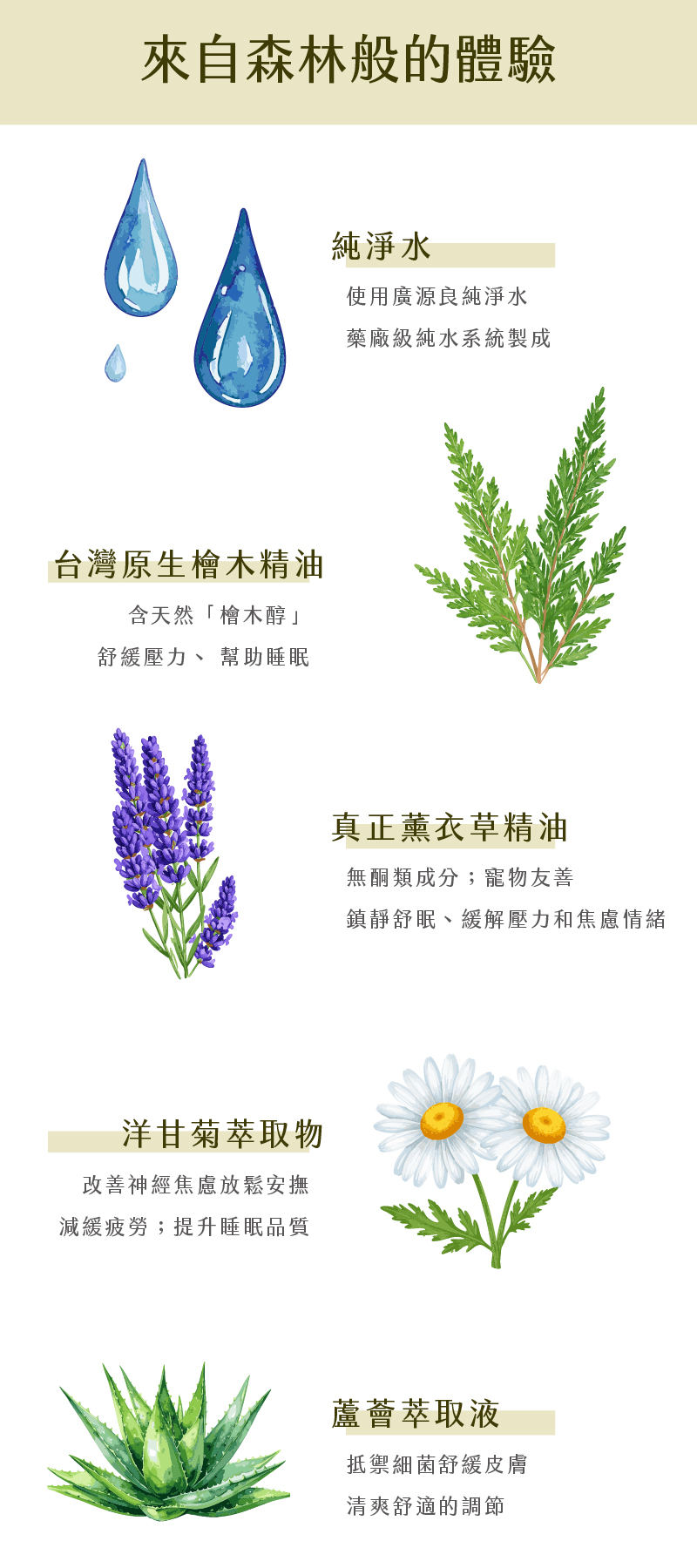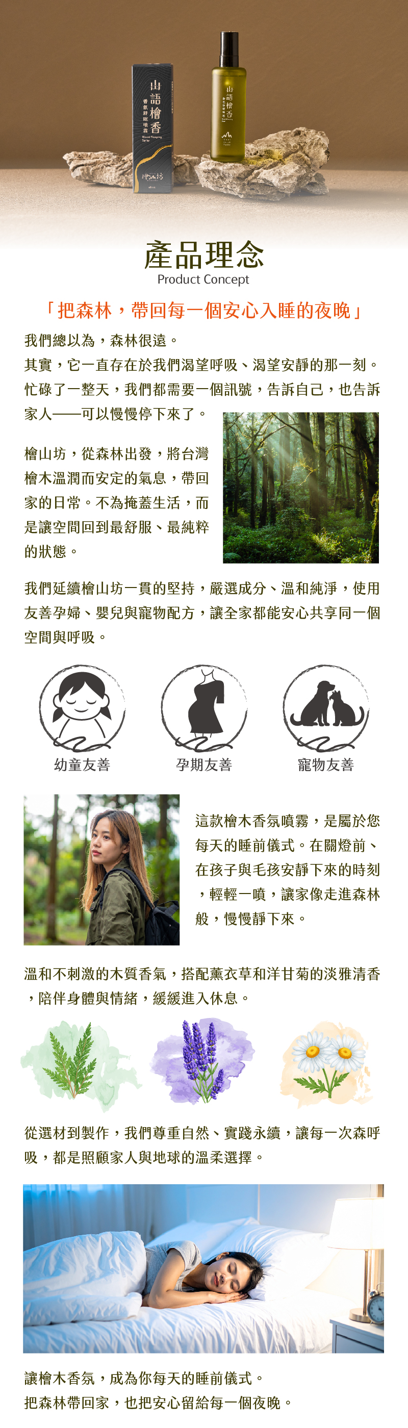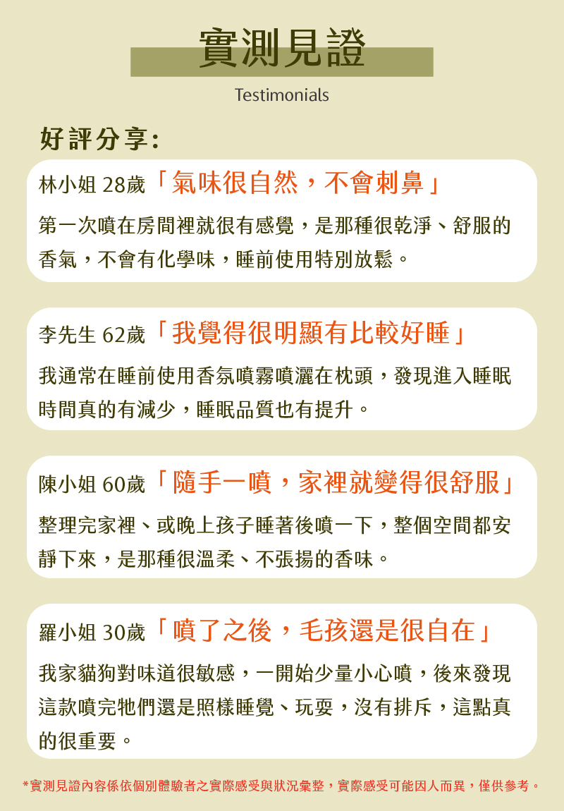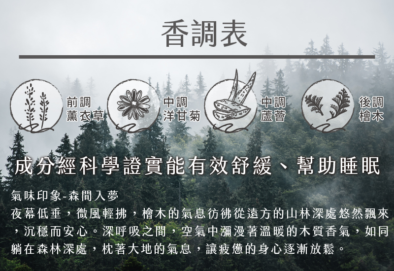 🌲 天然植萃舒眠配方嚴選純天然 檜木精油、洋甘菊精油、薰衣草精油,氣味溫和不刺激,有助於放鬆緊繃情緒,營造適合入睡的安定氛圍。