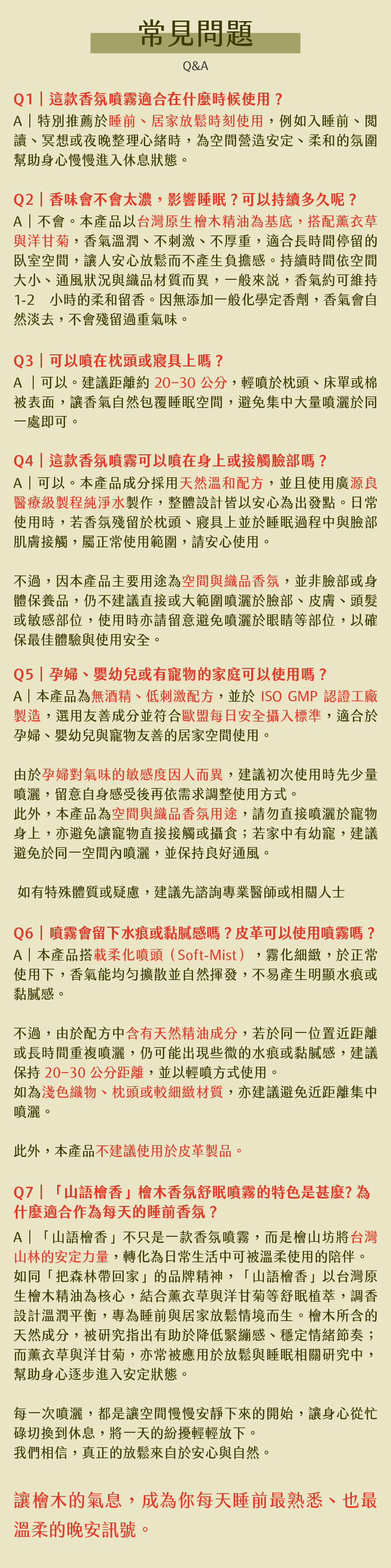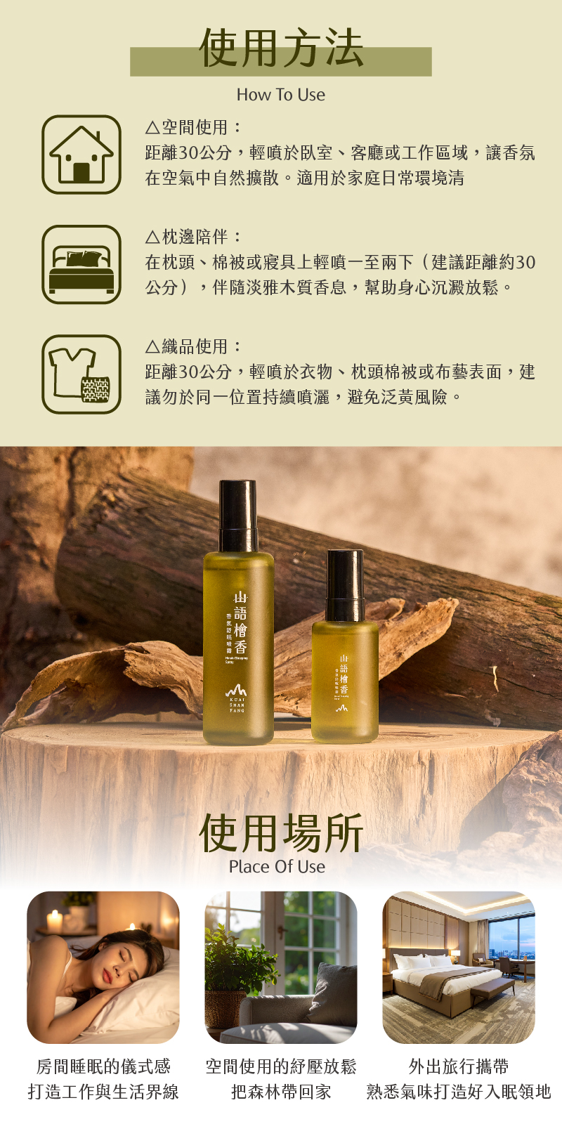 睡眠使用|建議於睡前 10–15 分鐘,於臥室空間輕噴,讓香氛自然擴散,搭配深呼吸,幫助身心放鬆,營造舒眠入睡的安定氛圍。