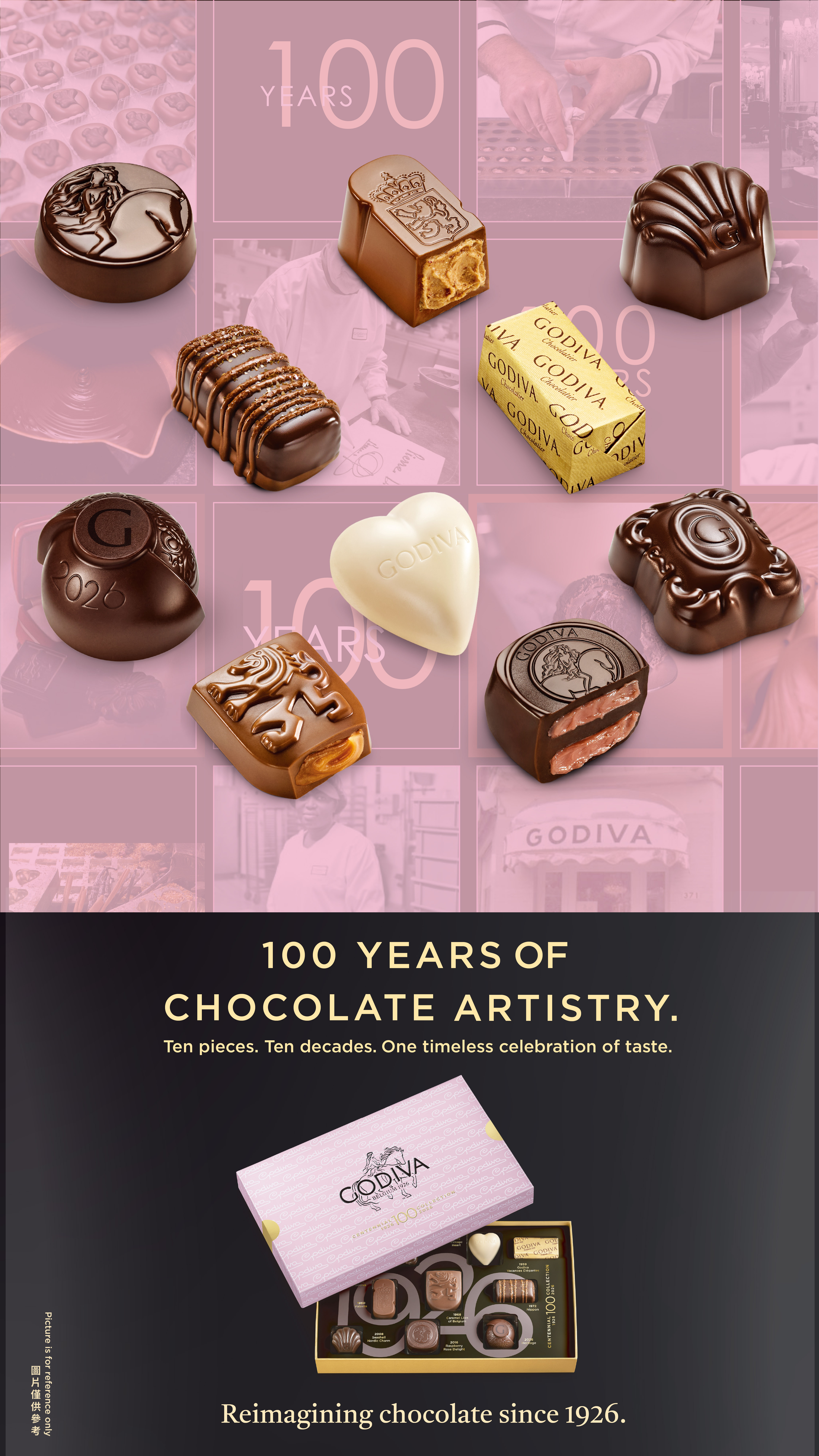 此次推出的百周年限定巧克力禮盒共收錄10款作品,其中9款來自 GODIVA 不同年代的經典巧克力,另1款則為百周年特別推出的「2026 開心果杏仁黑巧克力」。從品牌早期作品到近年的經典風味,完整呈現 GODIVA 不同時期的代表作與其背後故事,讓這款禮盒更具紀念意義。在包裝設計上,禮盒外觀以柔和粉色為主視覺,呼應百周年主題;開盒後,內盒可見「1926」字樣,象徵品牌創立年份,從內容到設計皆展現百周年限定的收藏價值。