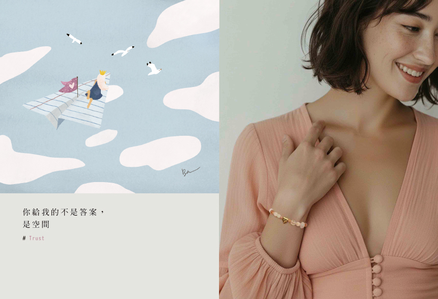 Trust|你給我的留白|太陽石粉東陵玉手環一條 / 金句卡1張 / 軟性珠寶布 / 禮盒及信封各1 ( 隨機出貨 )材質 | 鈦鋼 ( 親膚低敏 ) / 鍍18K金 ( 高保色 ) / 橙月光太陽石 / 馬粉水晶 / 粉水晶 / 粉東陵玉 / 象牙卡