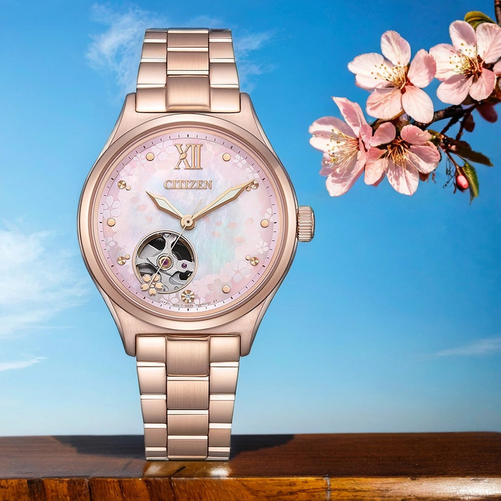 錶盤結合粉蝶貝材質,彷彿在櫻花樹下仰望晴朗天空