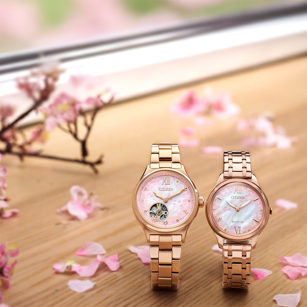 母親節推薦款,櫻花限定環保光動能,時、分、秒大三針粉蝶貝錶盤,特殊錶盒包裝