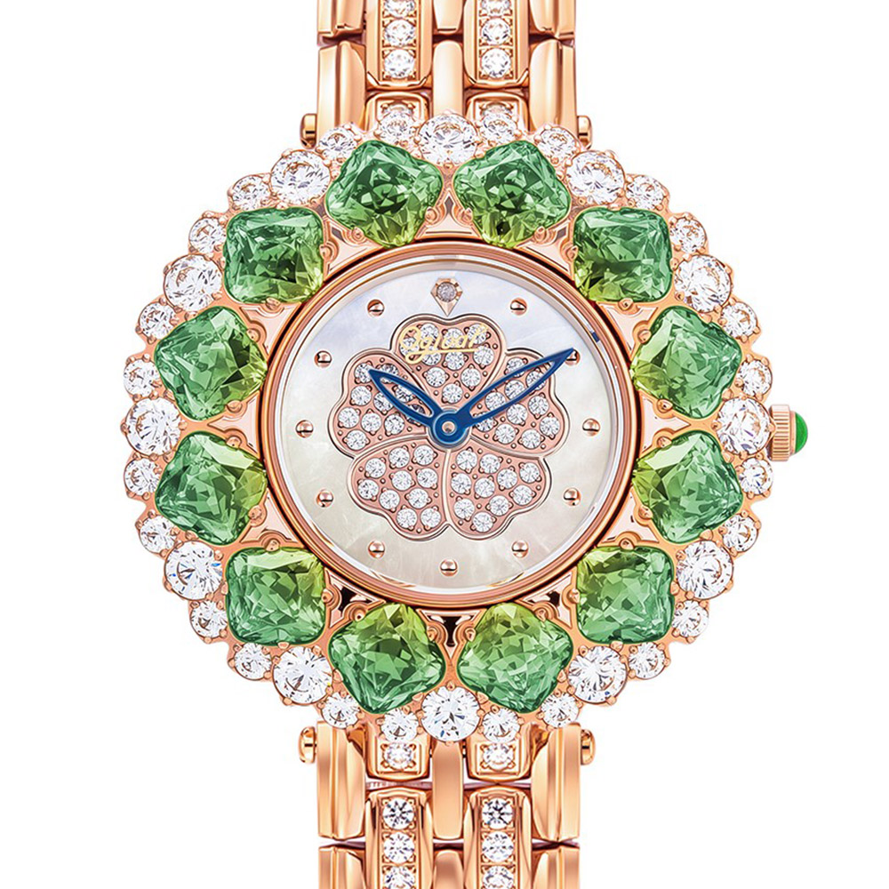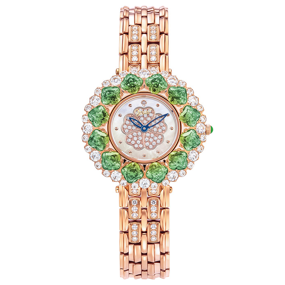 而圍繞其外的漸層寶石,如同穿透森林樹梢的晨曦掠過花瓣,從深邃翠綠到迷人嫩綠。