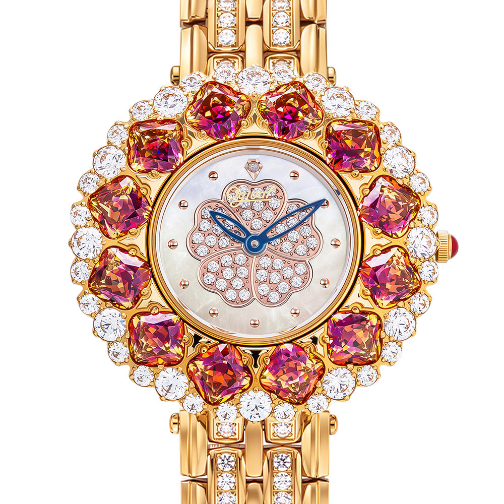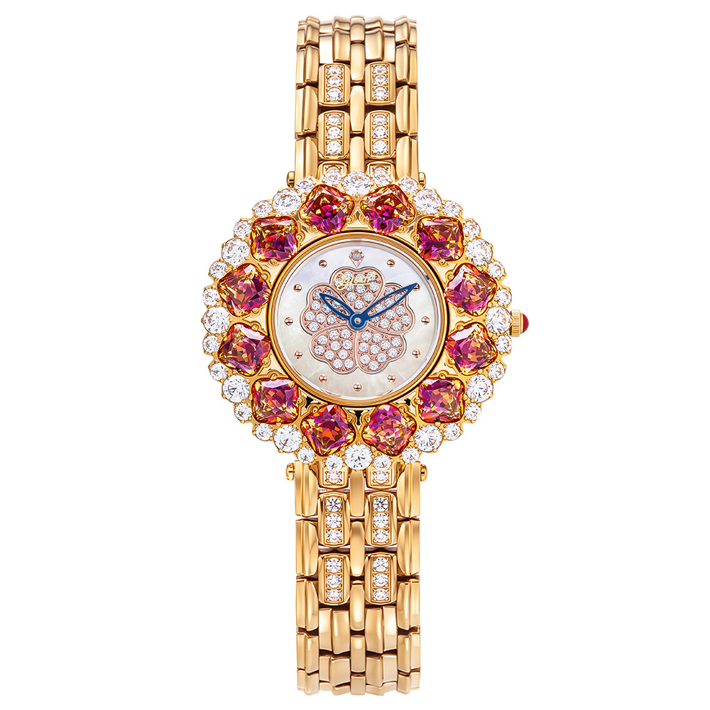 精緻的錶帶工藝與立體花瓣設計相互呼應,將複雜的珠寶鑲嵌工法轉化為腕間的輕盈點綴。