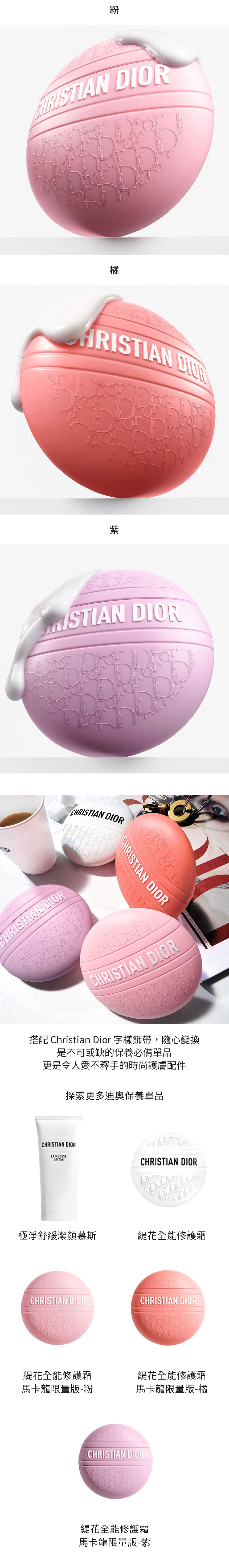 全新《迪奧緹花全能修護霜 馬卡龍限量版》,為DIOR經典緹花瓶身注入馬卡龍色彩:柔嫩「粉」、活潑「橘」、浪漫「紫」,搭配 Christian Dior 字樣飾帶,隨心變換,是不可或缺的保養必備單品,更是令人愛不釋手的時尚護膚配件。輕巧便攜,隨時隨地呵護肌膚。