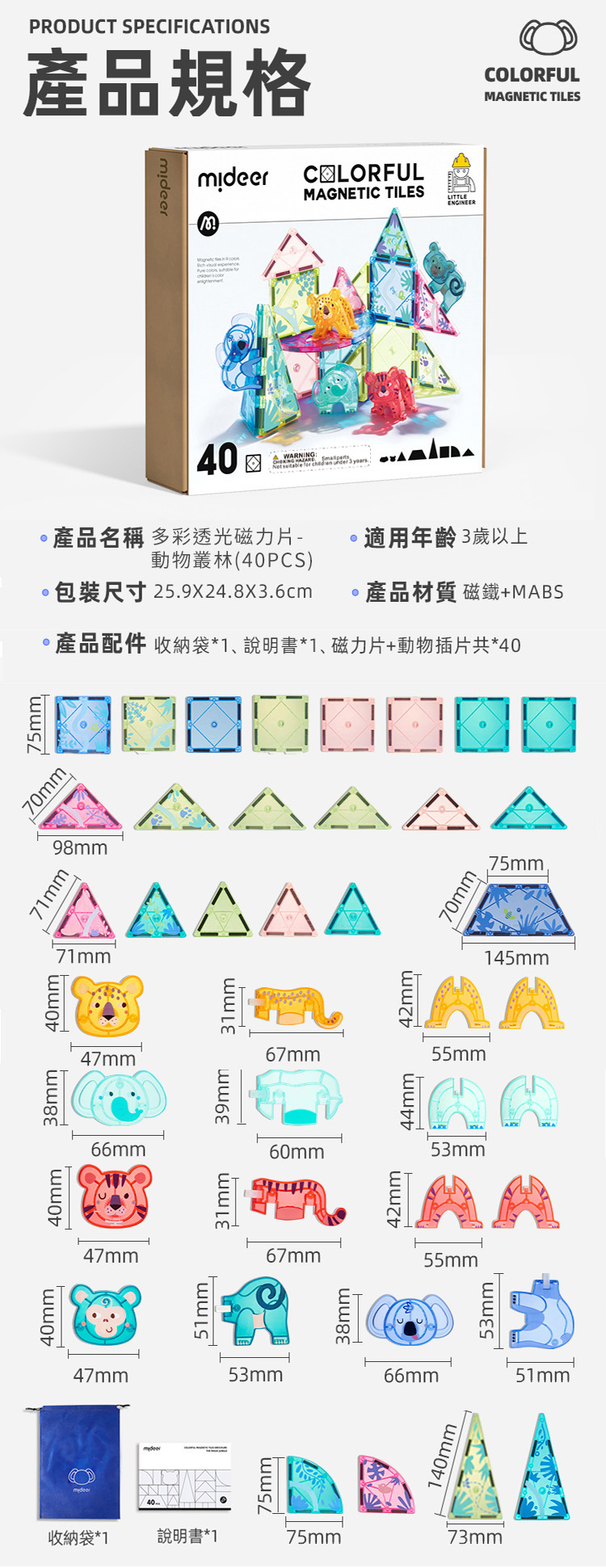 【OOYII吾憶】MiDeer多彩透光磁力片-動物叢林(40PCS)|生日禮物、兒童禮物、聖誕禮物|