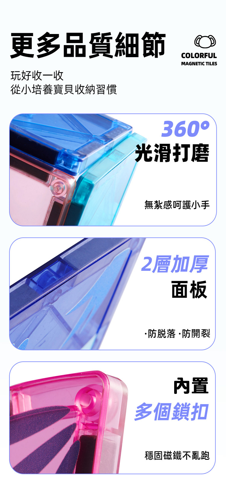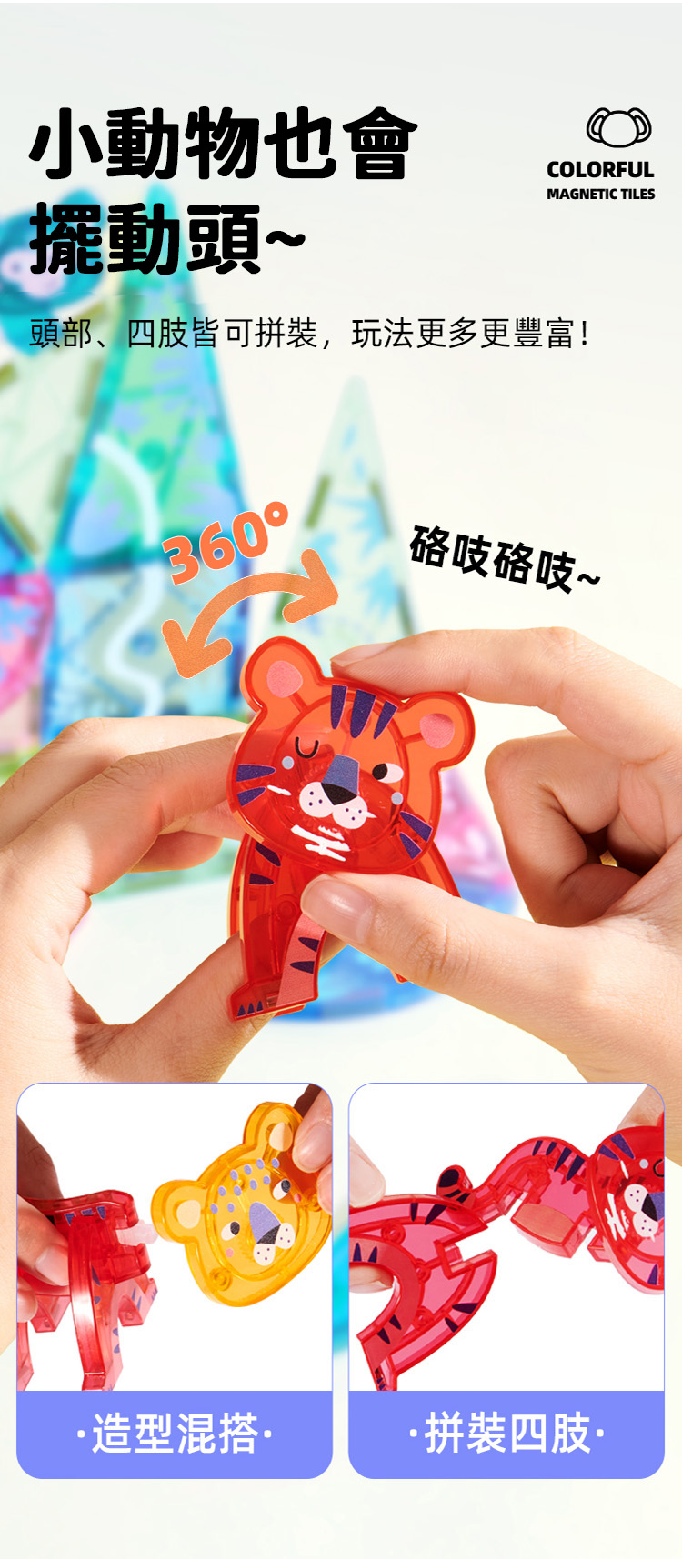 全新升級!擁有沉浸主題體驗和絢麗的光影效果!不僅是絢麗的磁力片,還具有加厚的磁芯和一體成型的設計。專業加厚的磁芯確保了絕佳的磁力強度和長久的使用壽命。可以在磁力片的表面上看到美麗的森林主題圖案,搭配著五隻可愛的小動物,仿佛置身於一個生動的叢林中。在這個以寓教於樂為理念的產品中,您可以通過多種形狀和色彩的碰撞組合,激發孩子的想象力,開發創造力。透明鑽面設計,可折射出炫彩的光影效果。具高透光度,獨特斜面設計在光的折射下讓人彷彿置身於梦幻城堡之中。值得一提的是,這款磁力片還配有加厚的透明管道,讓珠子滾動時可見度更高。當您將這款磁力片與其他的磁力片組合在一起時,不僅會使場景結構更加穩固,更能打造出一個流光溢彩的動物叢林。這款磁力片的尺寸達到了7.5cm,大片設計更適合低齡寶寶的抓握。通過超聲波無縫衔接的技術,實力防跑芯!一體成型的設計讓它更加耐摔,而四周的雙重加固結構可以有效地防止磁芯掉落並造成誤食的情況。此外,這款磁力片選用優質的ABS材料,使其更加堅固耐玩,成為孩子成長的好夥伴。配備的收納袋,讓您可以輕鬆地存放所有的配件,從小就培養寶貝的收納習慣。為孩子們打造夢幻動物叢林的絕佳選擇!擁有它,您的孩子將享受到無盡的遊戲樂趣和豐富的學習體驗。