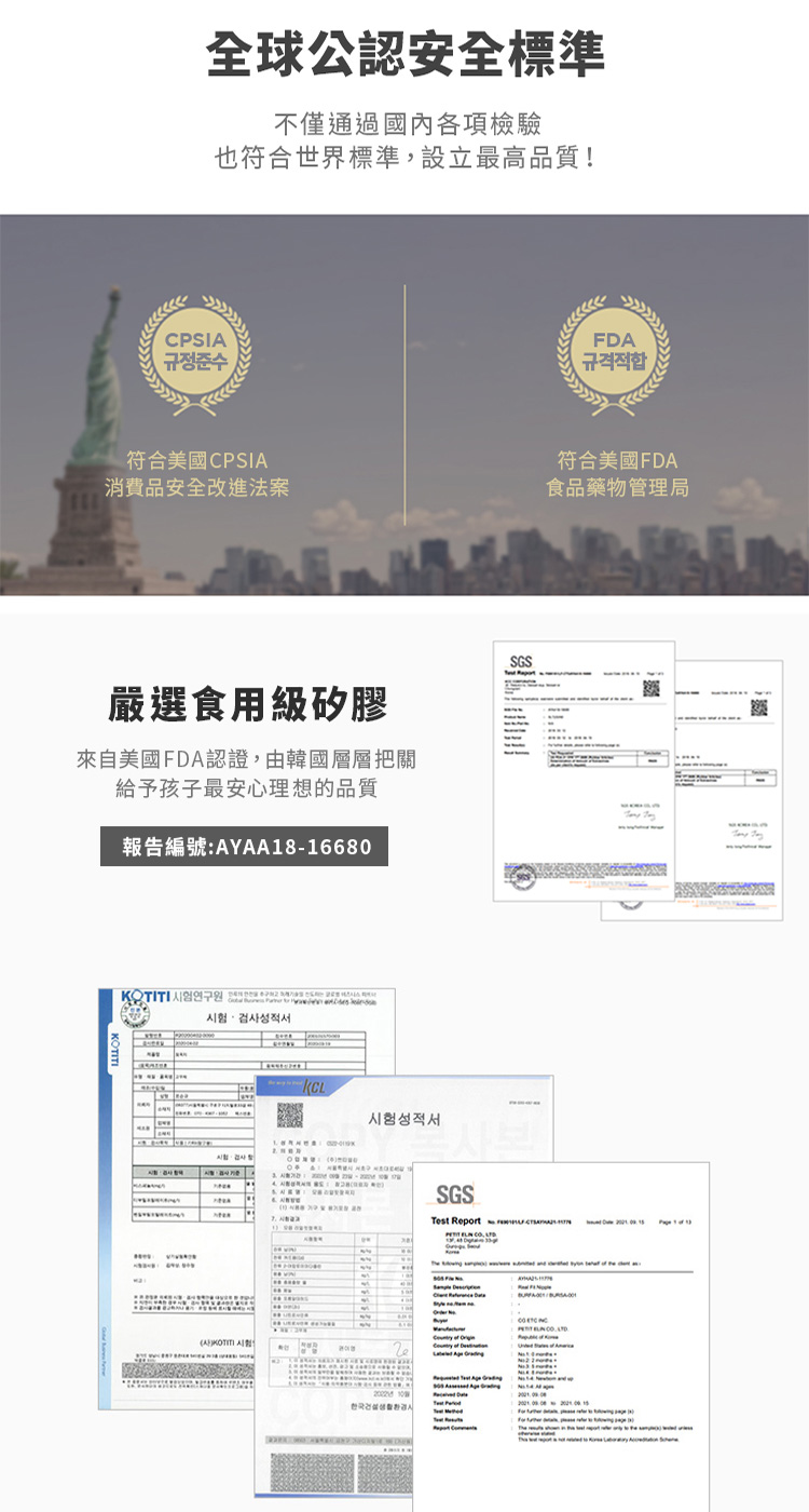 選用食品級矽膠材質,經美國FDA、CPSIA認證,符合全國公認安全標準!