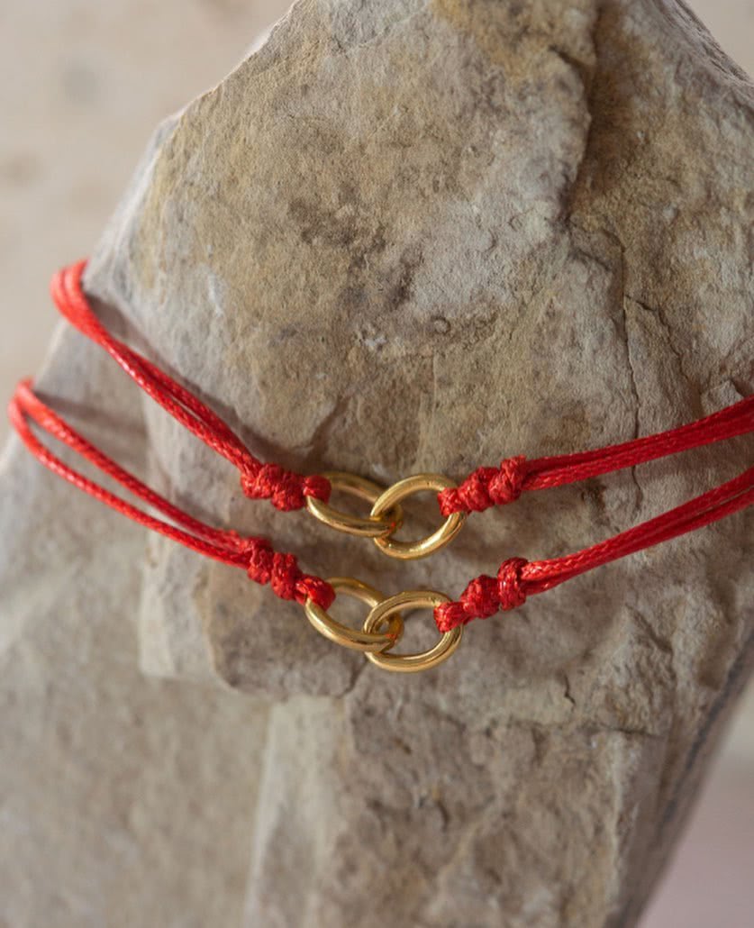 【MantraBand】美國悄悄話 金色圓滿雙圈對鍊 幸運紅繩手鍊 2件組(幸運紅繩手鍊)