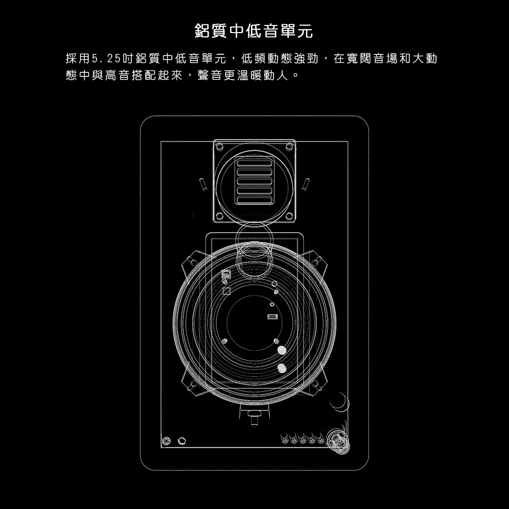 5.25吋鋁質中低音單元,低頻動態強勁,與高音搭配起來,聲音更溫暖動人。
