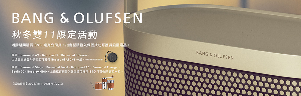 活動期間2025/11/1~2025/11/20止 凡購買B&O遠寬公司貨,指定型號登入保固成功可獲得限量贈品。