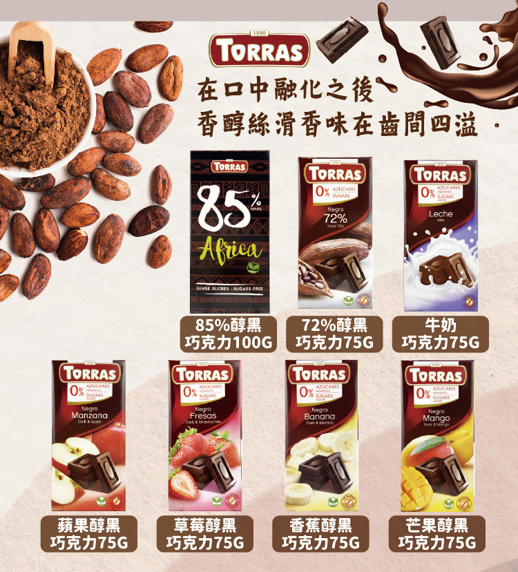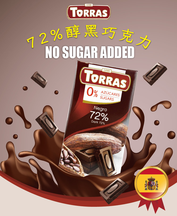 即期品【TORRAS 多樂】72%醇黑巧克力(75G 無加糖/麥芽糖醇/素食巧克力)