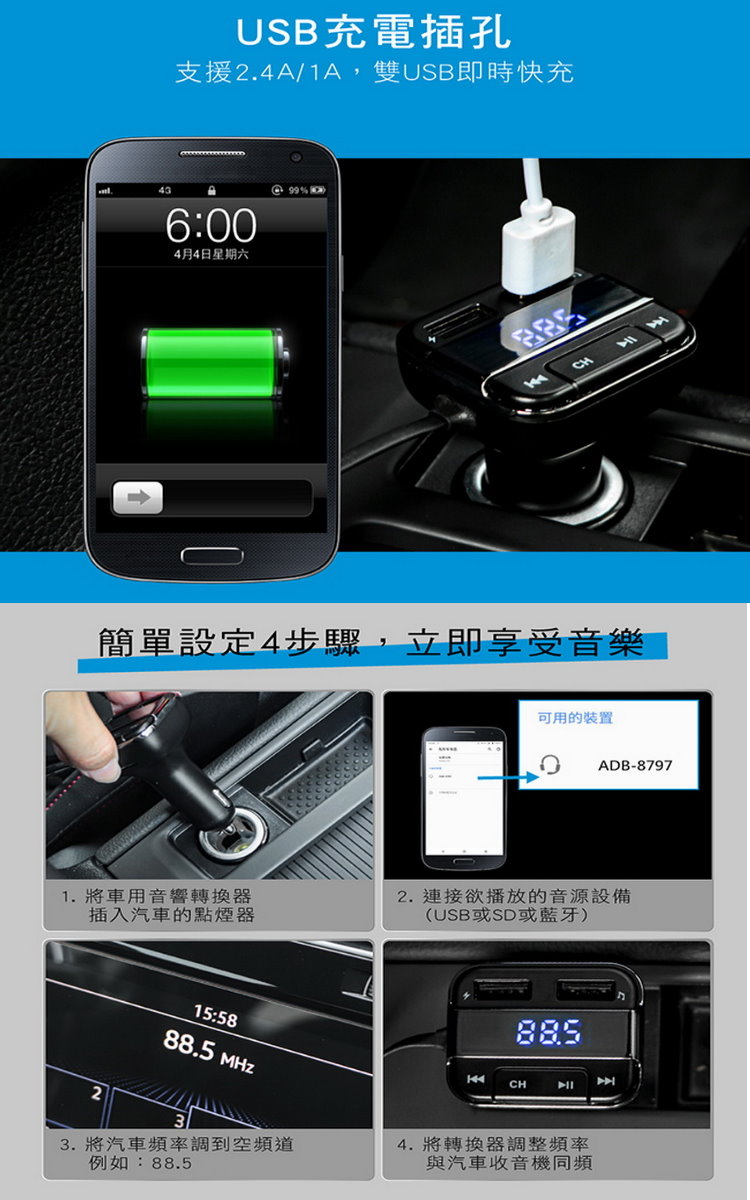 ■USB插孔,可連接隨身碟播放音樂最高64GB、可即時充電MAX 2.4A。