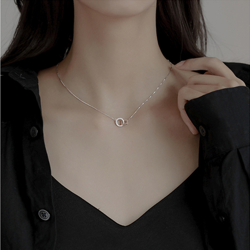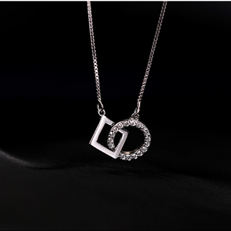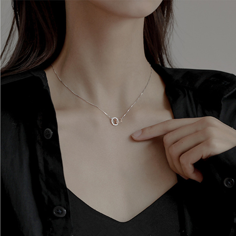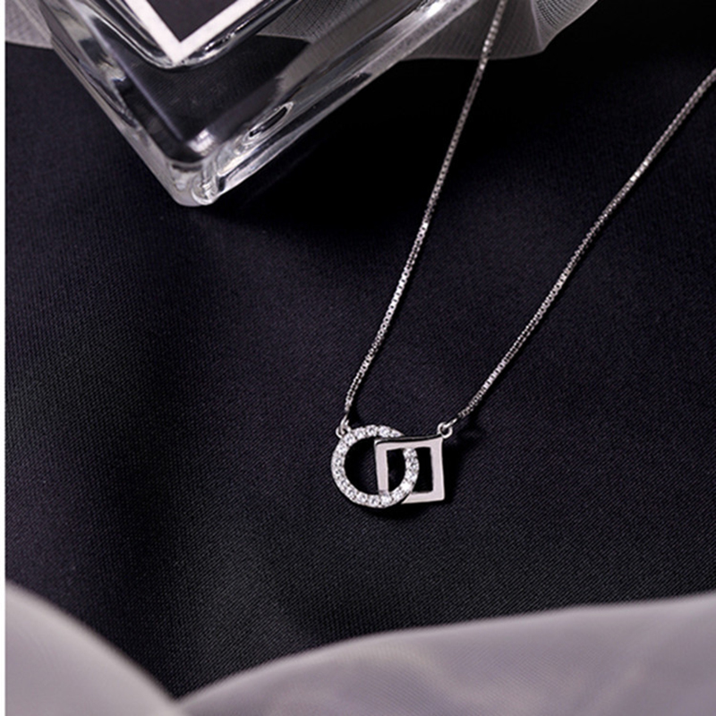 【Umi】韓式東大門圓圈方形扣微鑲鑽造型簡約奢華時尚優雅百搭銀項鍊(韓劇精緻情人節禮物)
