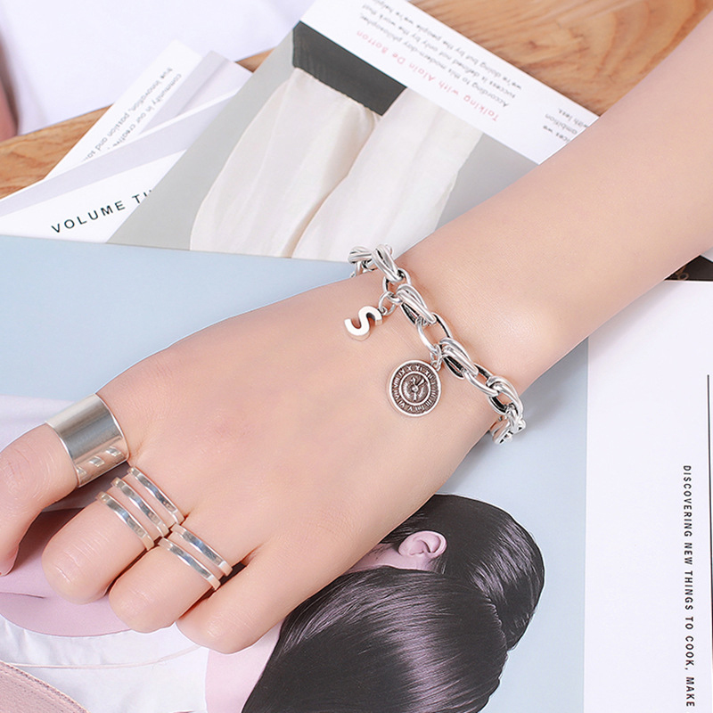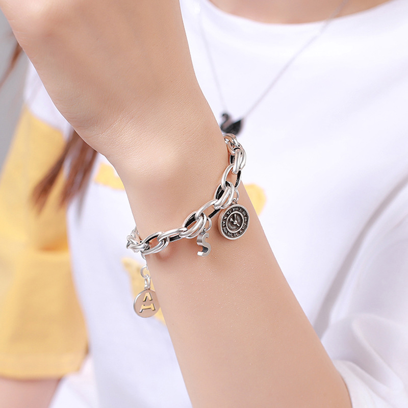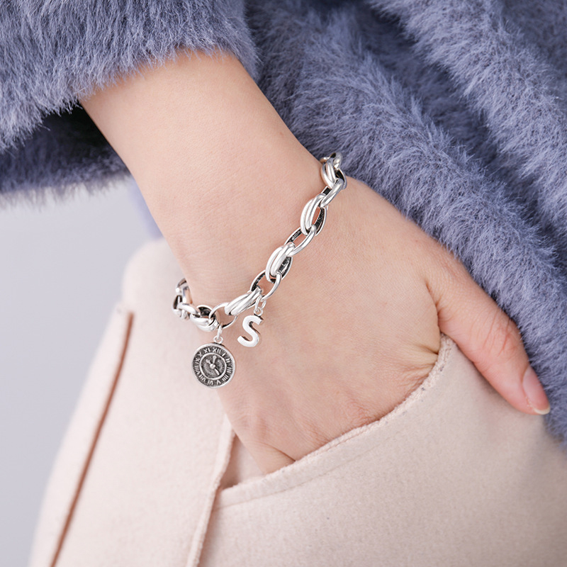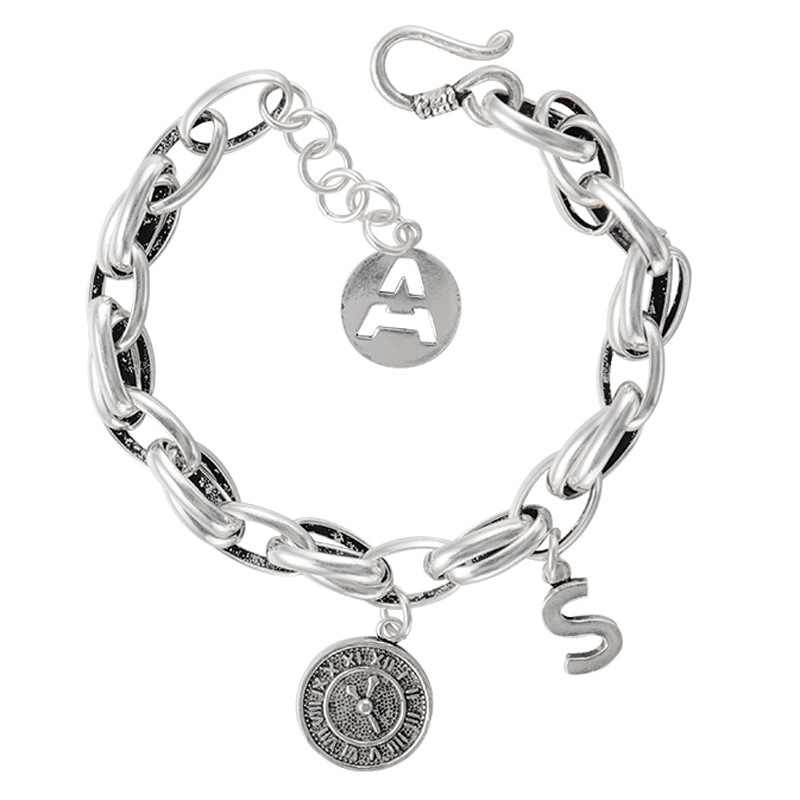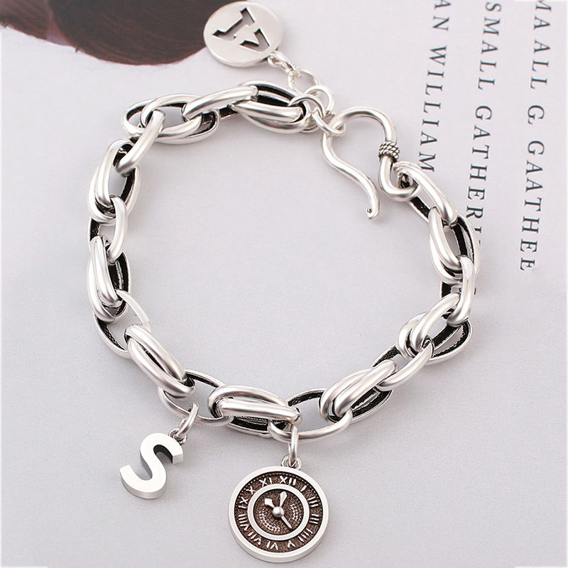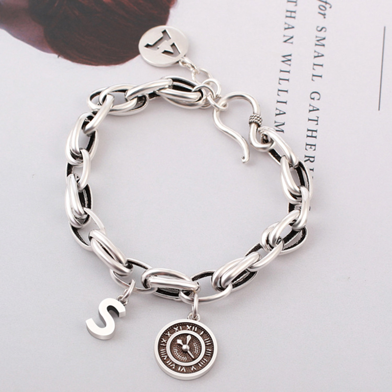【Umi】日式時尚百搭鎖鏈英文字母時鐘創意設計造型銀手鍊手環手鐲(S字母A字母 附延長鍊長短可調)