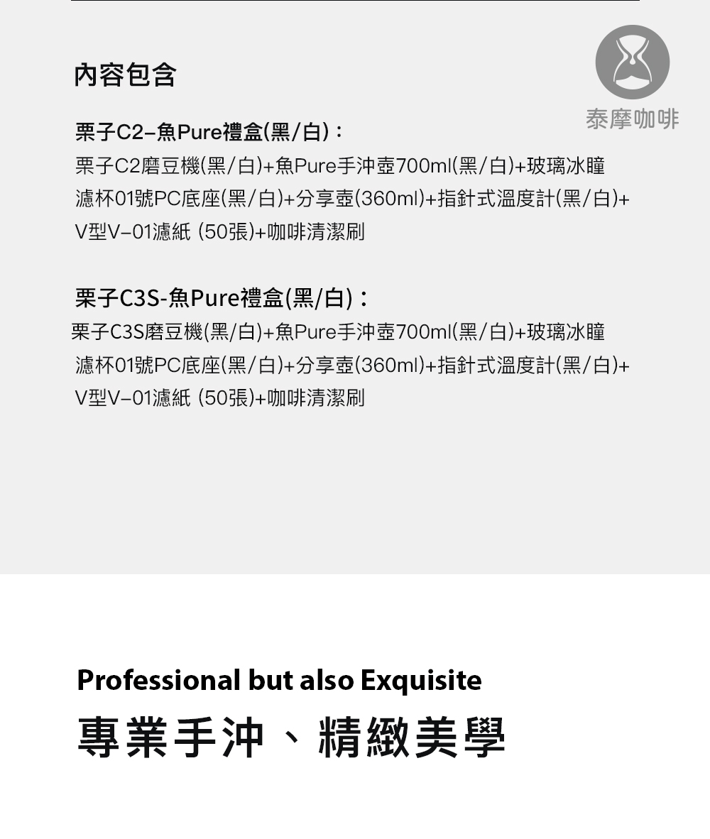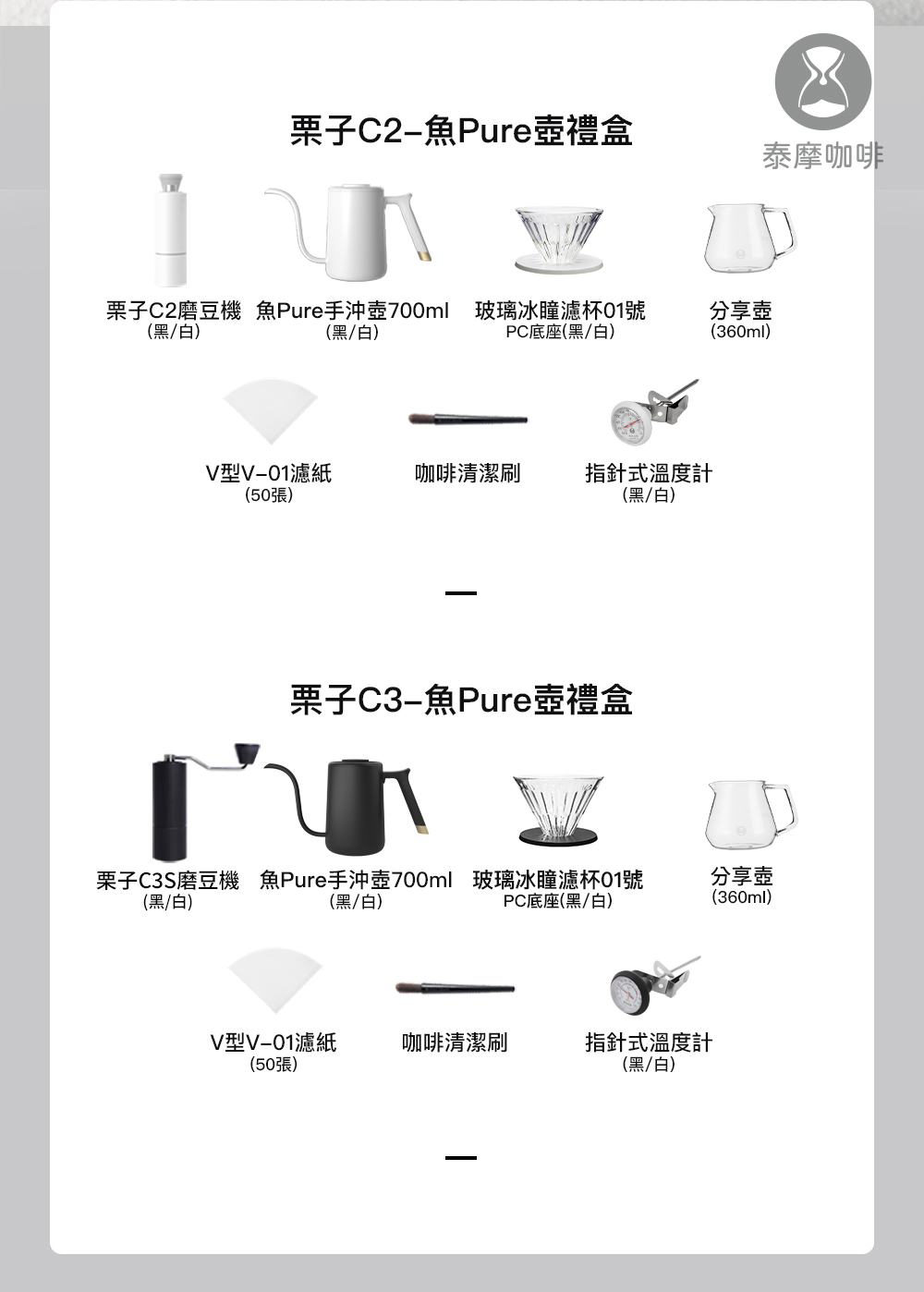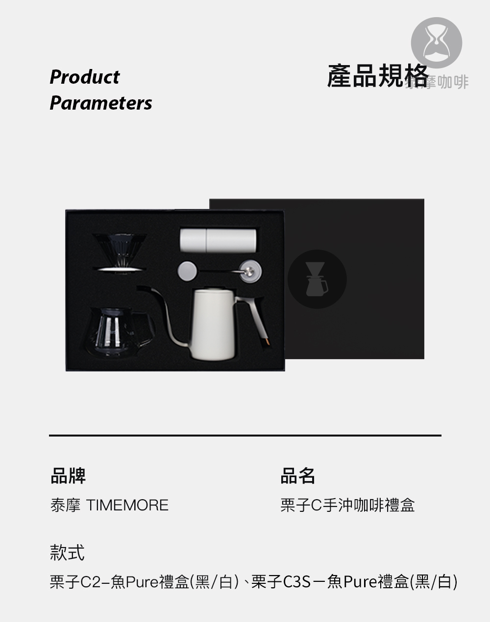 【TIMEMORE 泰摩】栗子C3S-魚Pure壺手沖咖啡禮盒黑色/白色7件組(獻禮美學誠意之選 露營 生日禮 入厝禮)