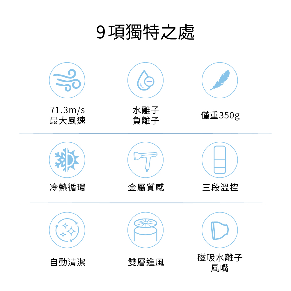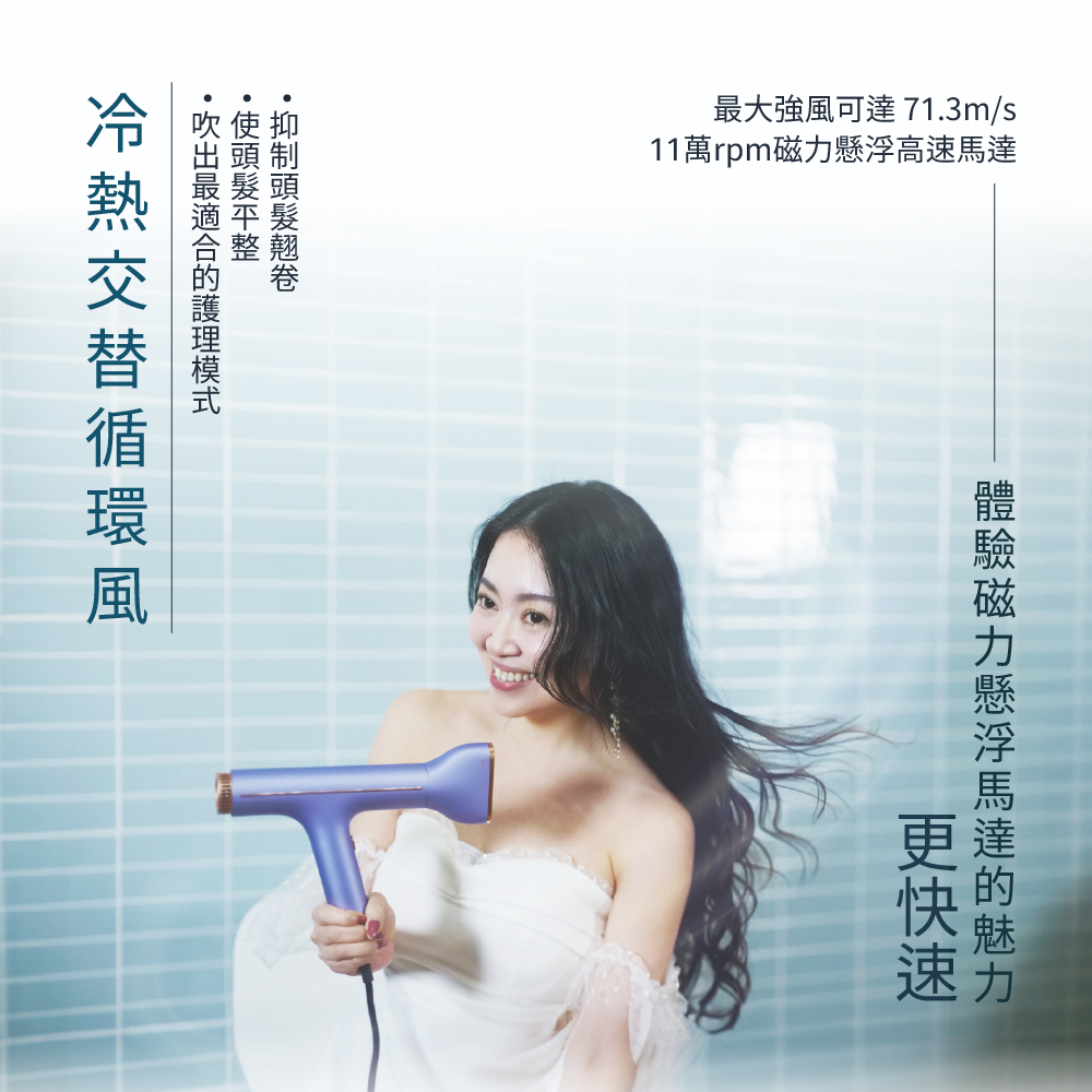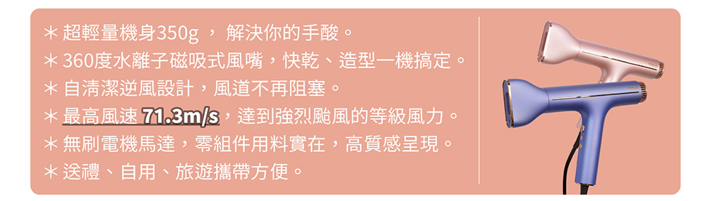 ➊ 實測71.3m/s的超高風速,能快乾並且造型您的秀髮,秀髮不再塌扁。