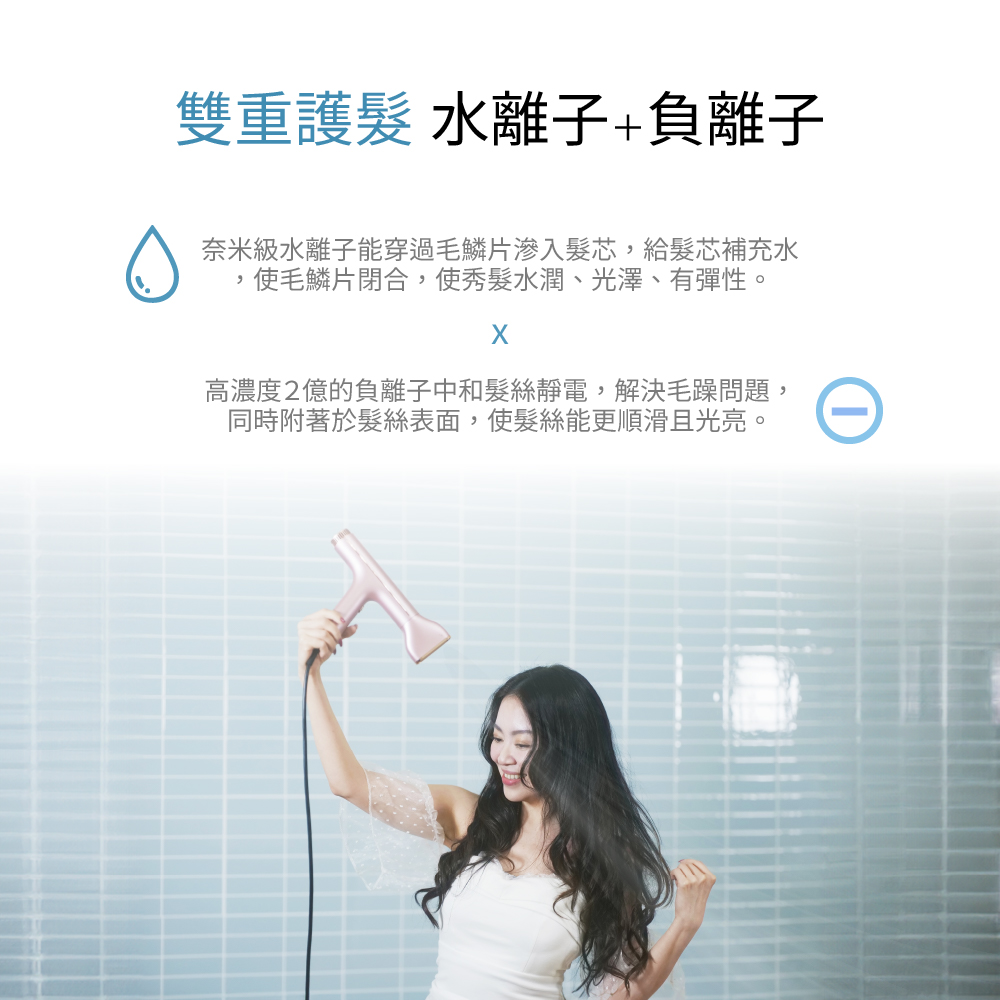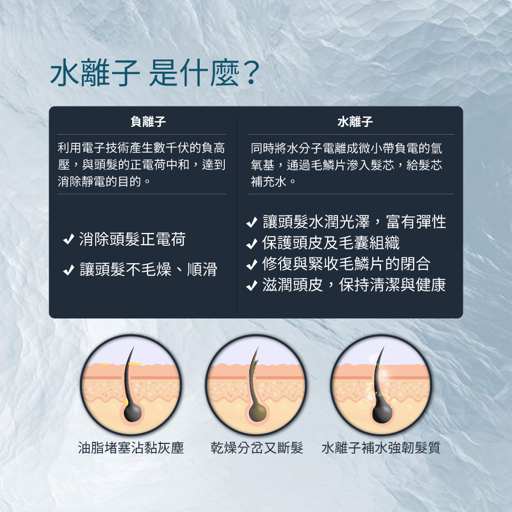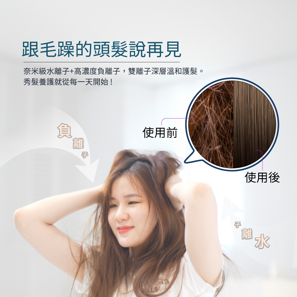 奈米級水離子能穿過毛鱗片滲入發芯,給發芯補充水,使毛鱗片閉合,使秀髮水潤、光澤、有彈性。高濃度2億負離子,解決毛躁蓬鬆的問題,增加柔順與保濕度。達到雙重護髮的效果。