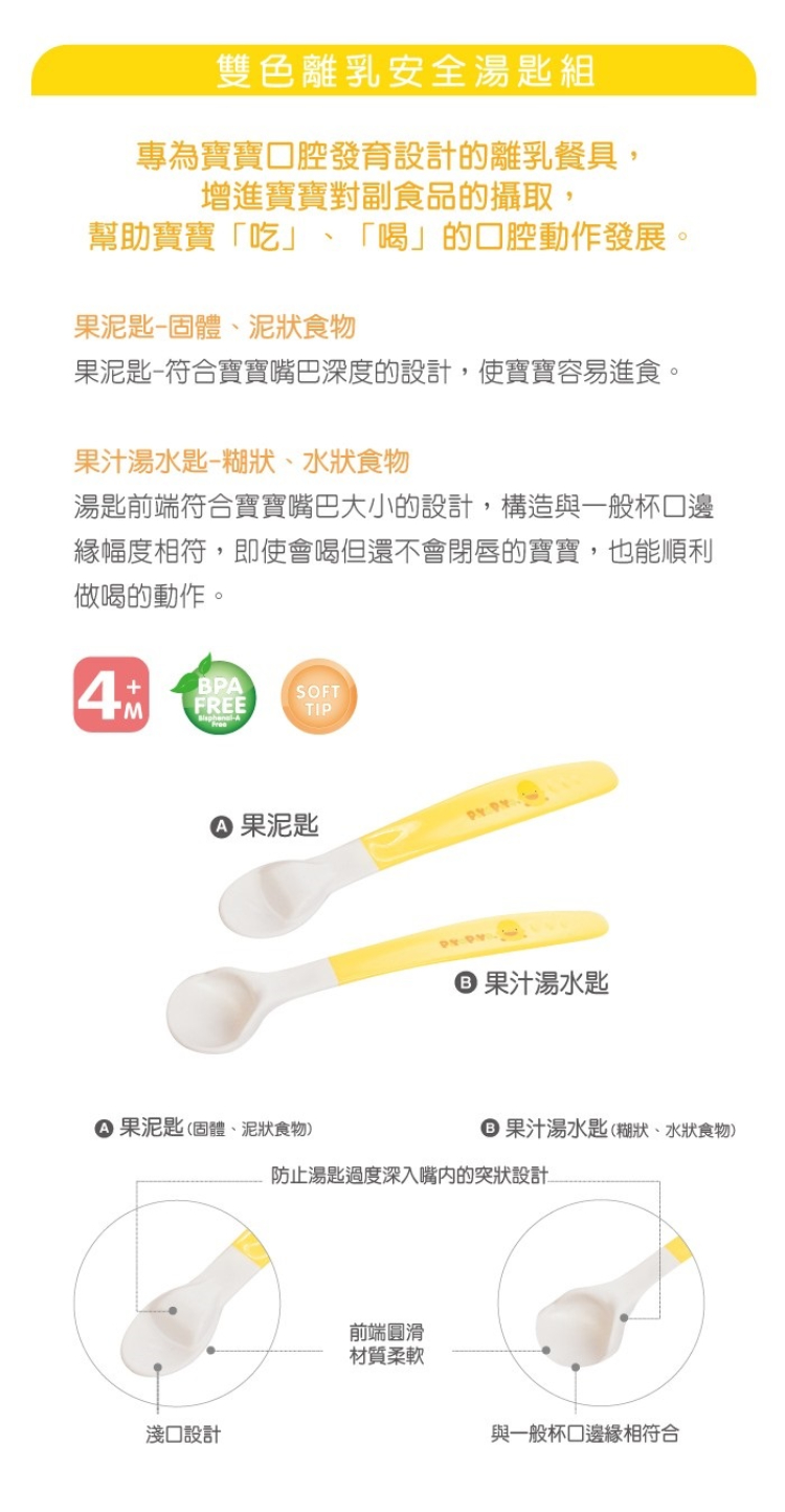.果泥匙:離乳初期-針對無法用力以上唇咬住湯匙上食物的寶寶,湯匙採用淺口設計,讓寶寶能順利吃到食物。
