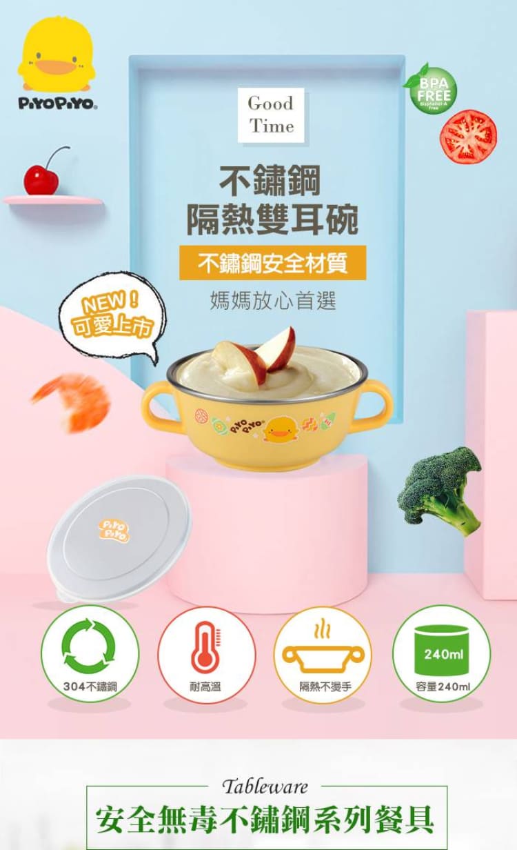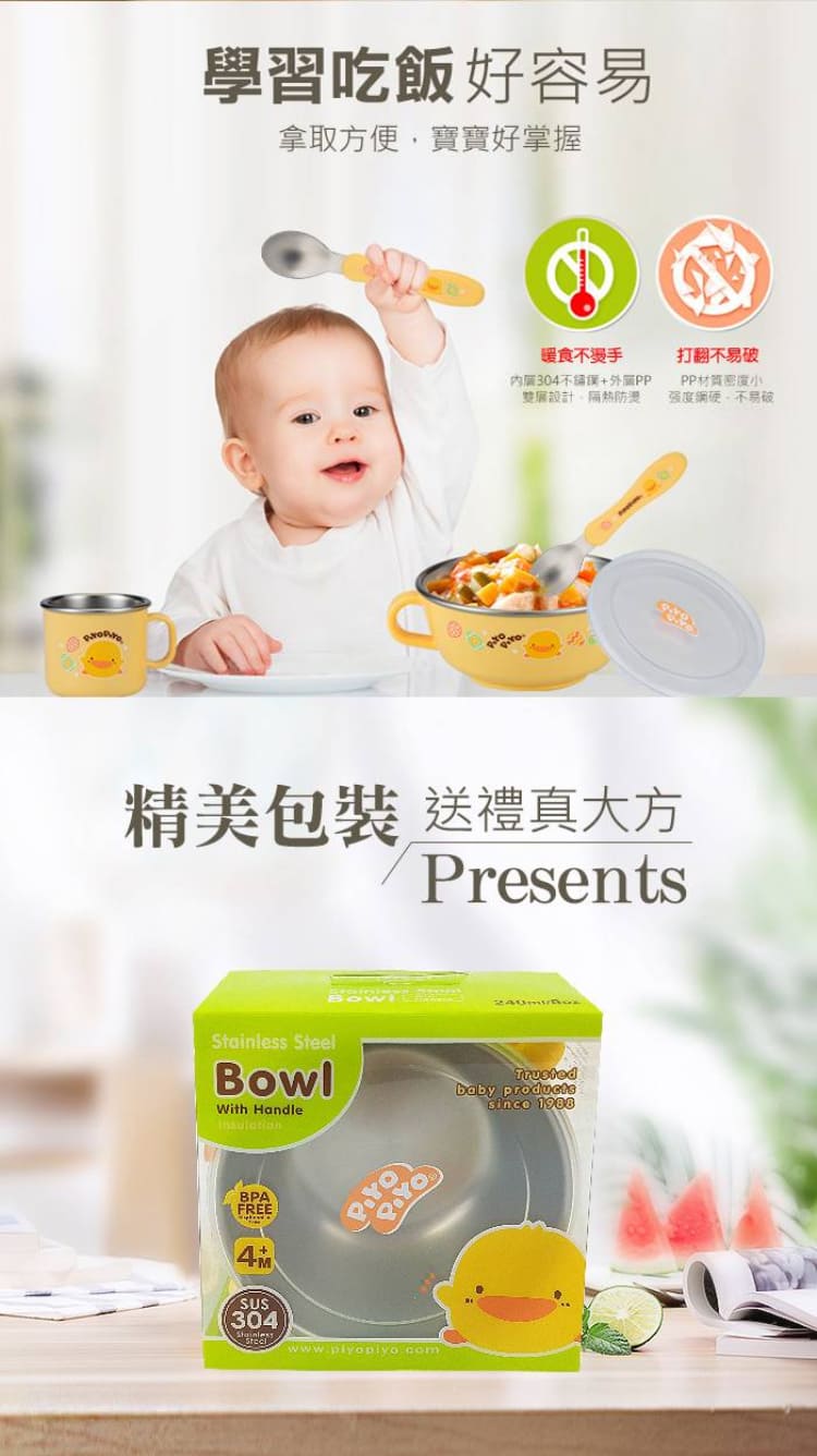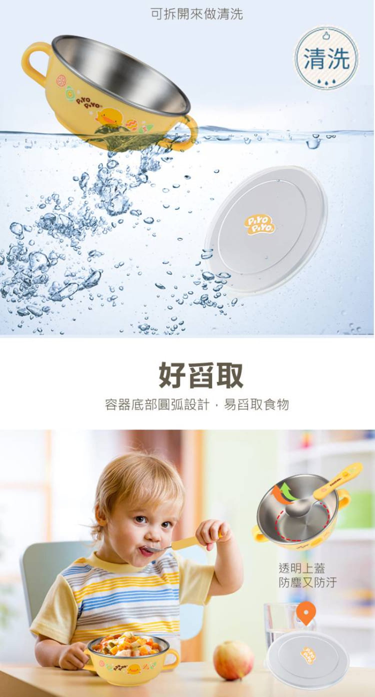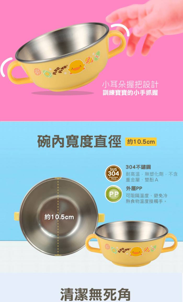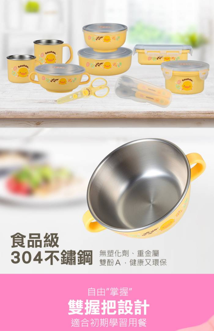 【Piyo Piyo 黃色小鴨】不鏽鋼雙耳碗(240ml 隔熱 耐高溫 304不鏽鋼 握把 防塵蓋 學習餐具)