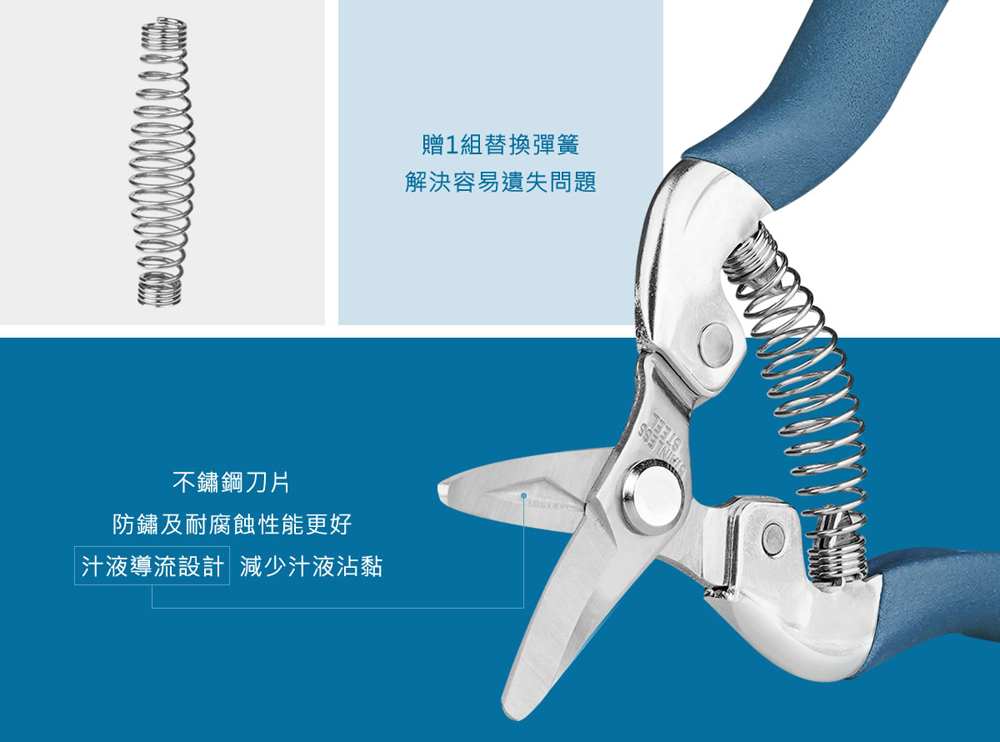 • 汁液導流凹槽的設計,有效減少剪切植物時汁液沾黏。