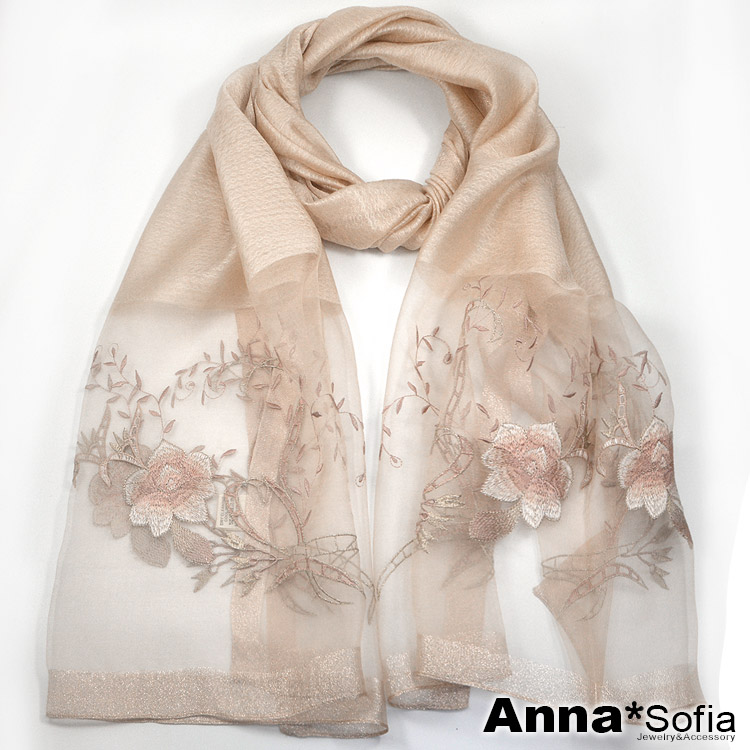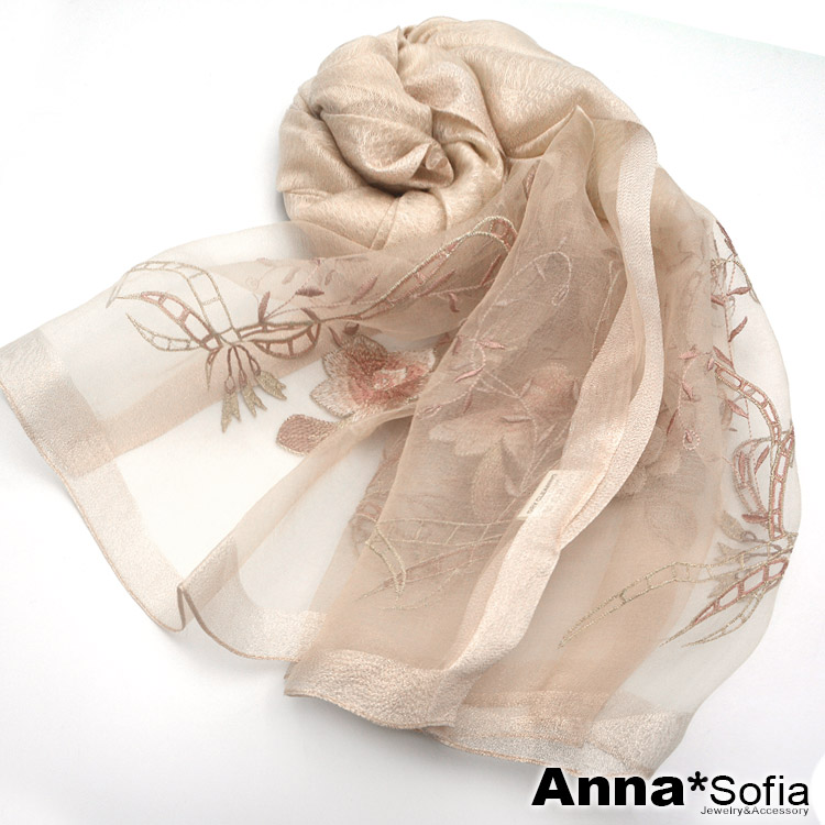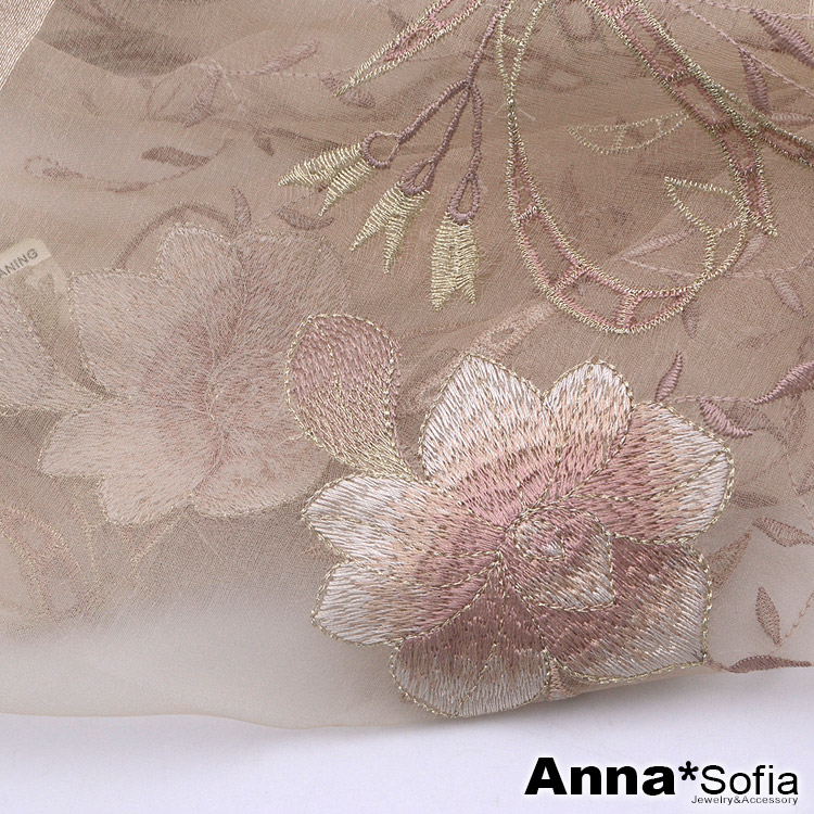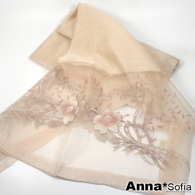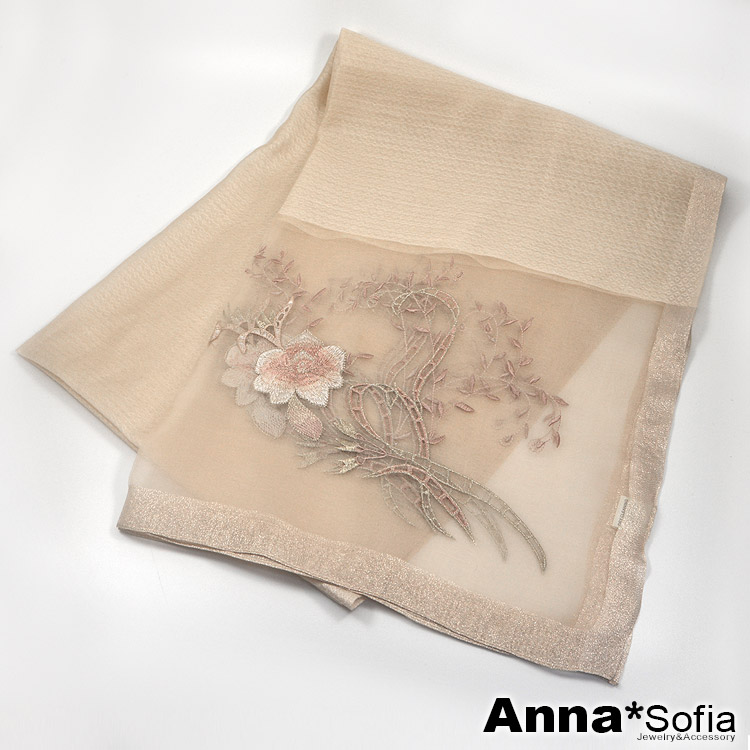 【AnnaSofia】真絲羊毛混紡大尺寸披肩絲巾圍巾-富貴繡花 現貨(杏駝系)