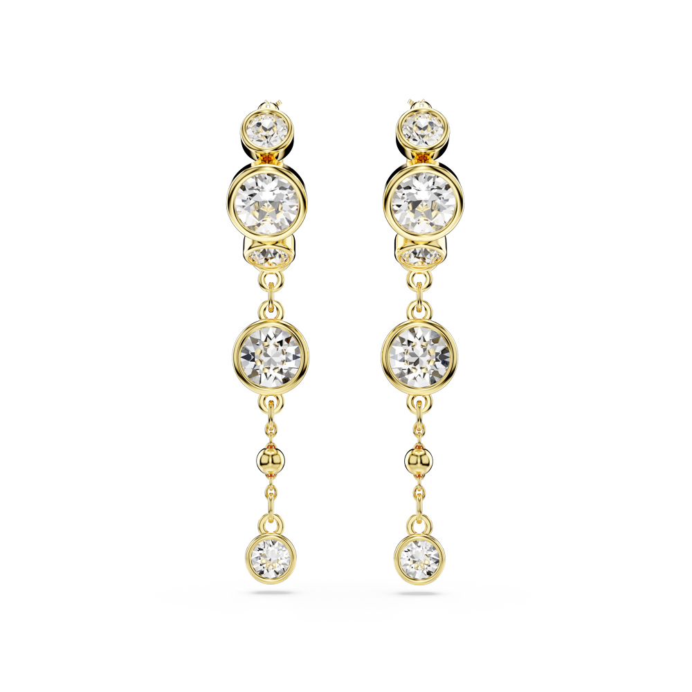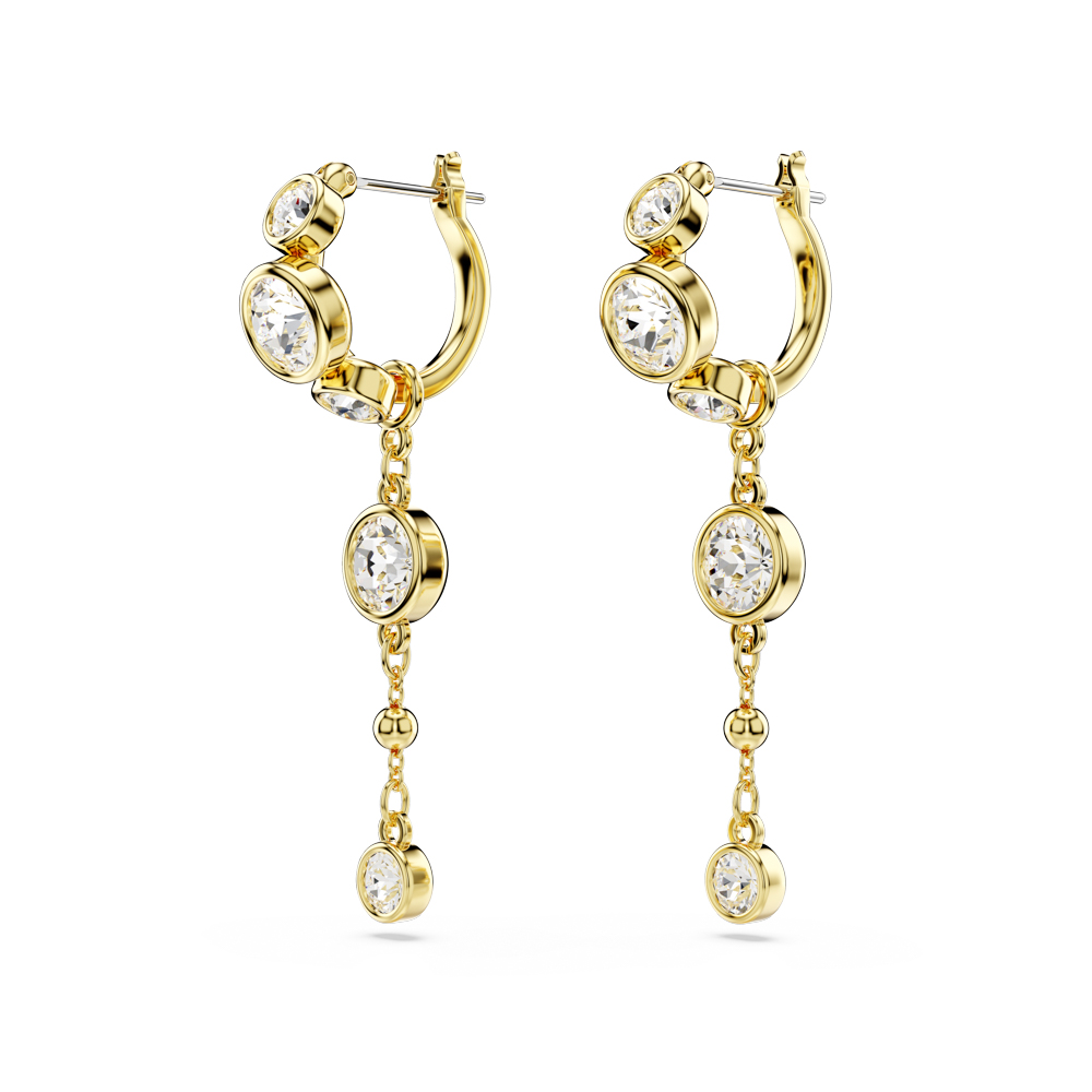 這對穿孔耳環動態間可以捕捉光線,瞬間讓您的裝扮更顯大氣高尚。每只鍍金色調耳環均搭配帶有可拆式懸鏈的小圈,從頭到尾飾以寬鬆邊框鑲嵌的圓形切割 Swarovski 水晶,並搭配閃亮的金屬水滴。對那些喜歡成為人群中注目焦點的人來說,這是一款百搭的選擇。