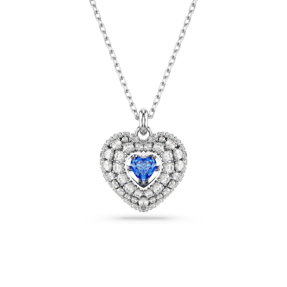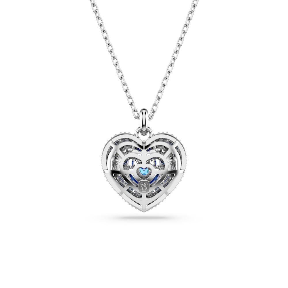 這款浪漫的 Swarovski 鏈墜將兩顆心合而為一。鍍銠圖案採用籠狀設計,呈現最大的膨脹效果。為了加強圓頂效果,以令人眼花繚亂的包夾鑲技術飾以圓形透明的 Swarovski 鋯石,中央則以藍色心形 dancing stone 捕捉來自各角度的光線。這是向特別的人說「我愛你」的完美方式。
