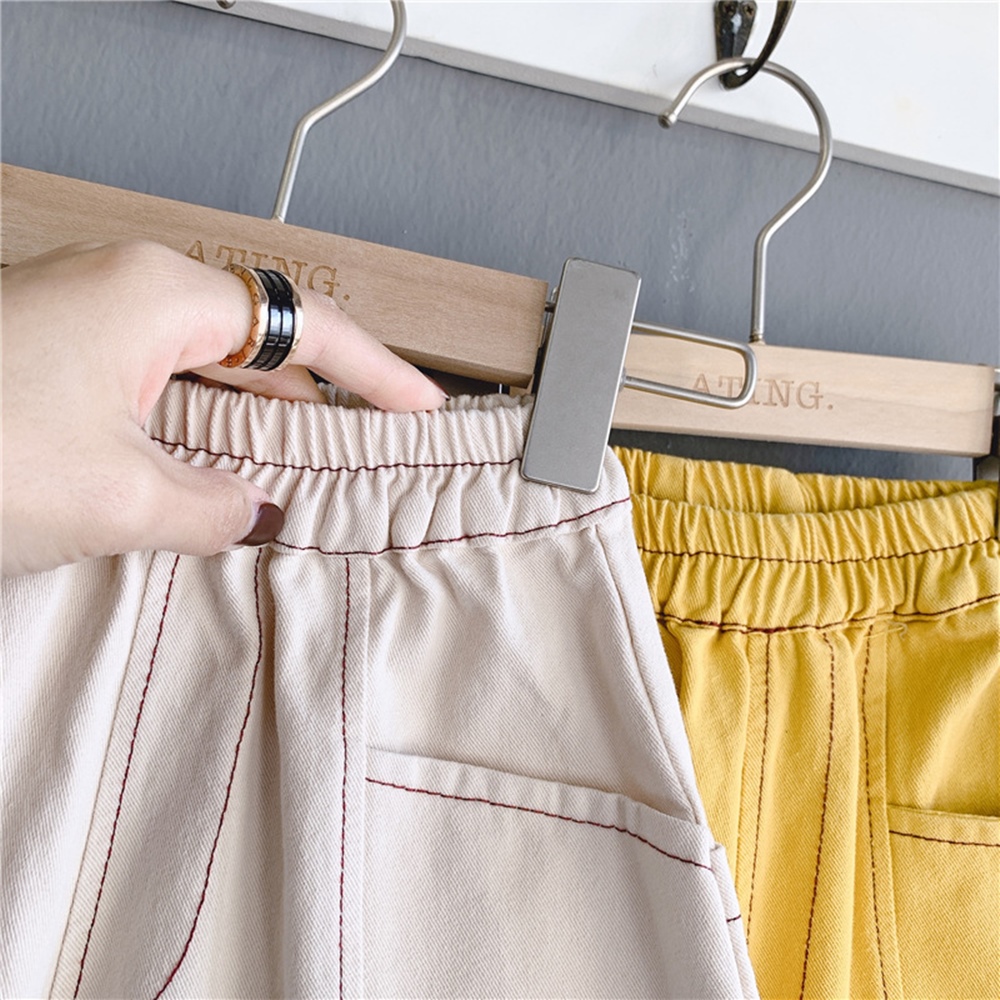 鬆緊褲頭,前面有兩個口袋,屁股後有兩個口袋