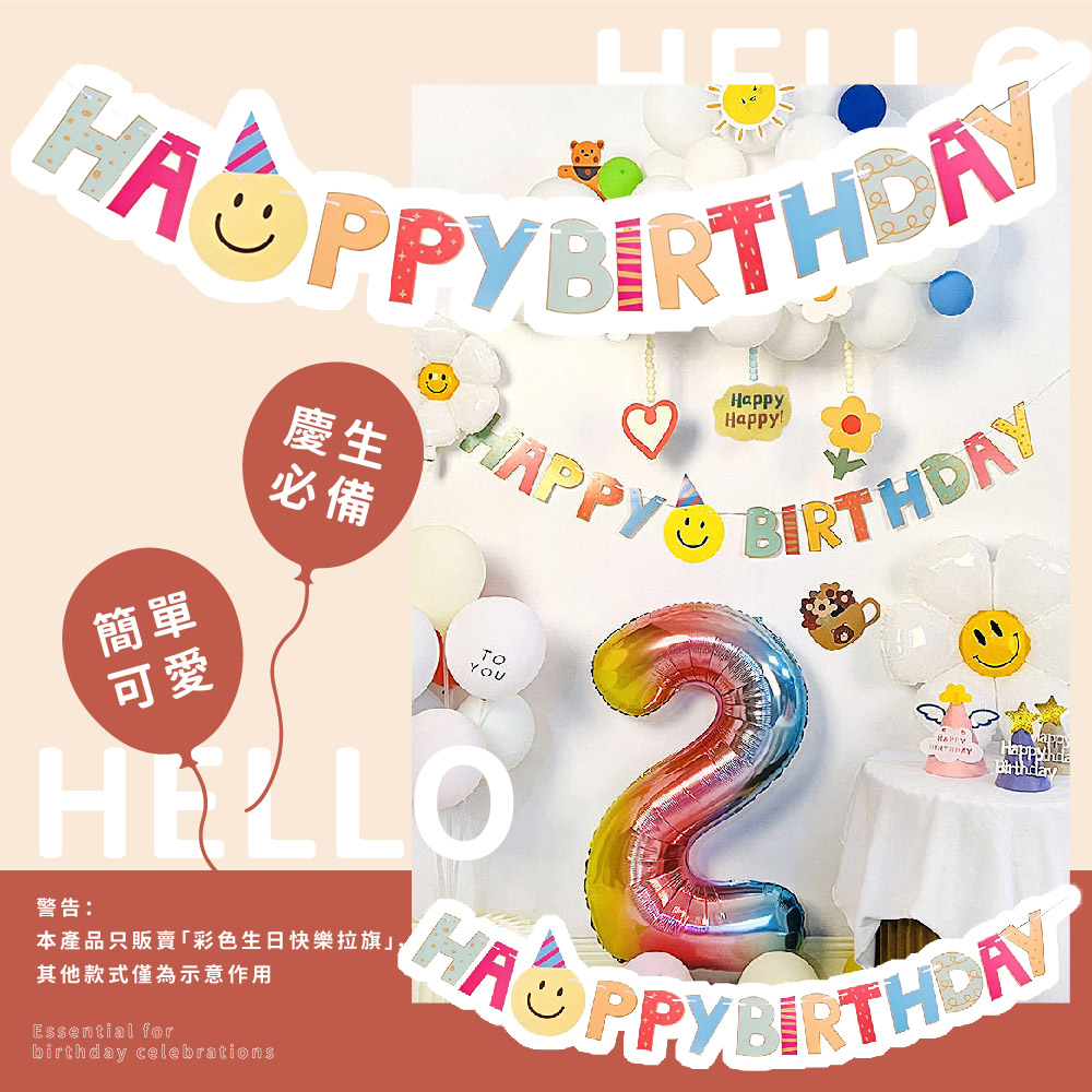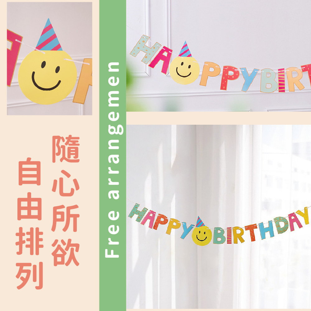 【場地佈置】ins韓系笑臉彩色生日快樂拉旗(掛旗 拉條 裝飾 生日橫幅 派對 布置 慶生 慶祝 周歲 拍照道具)