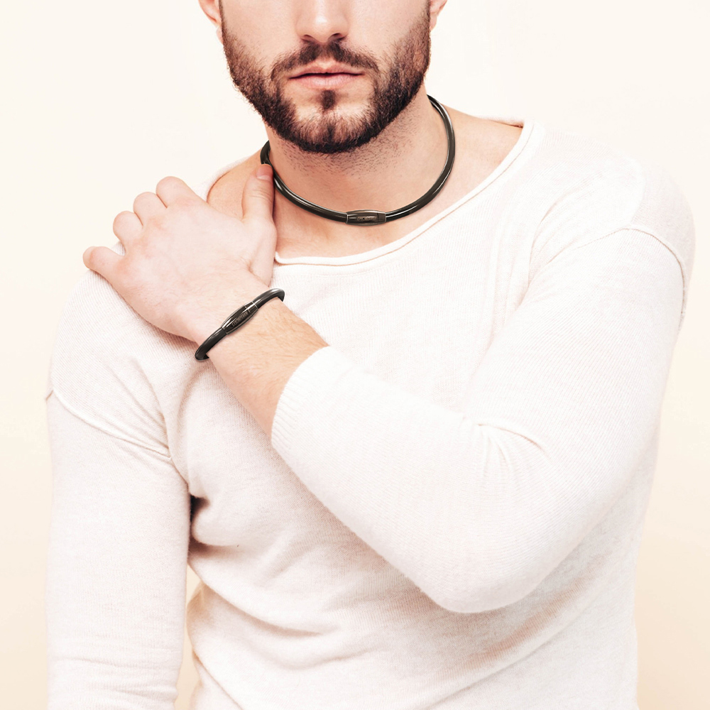 鍊身設計採用專利雙層6mm大管徑複合能量矽膠,並填充超微能量粉末,提供360度環繞的有感能量體驗。產品經過第三方公正單位檢驗認證,無輻射且無電磁波,使用安全無慮。國際巨星有氧天王潘若迪老師推薦,並以質感消光黑金屬包裝限量上市,無論自用或送禮都十分合適。