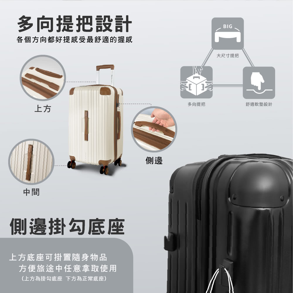 ● 附掛勾側邊底座設計,避免愛箱直接與地面接觸造成磨損,上方底座可掛置隨身物品,方便好拿取(下方底座為一般底座)
