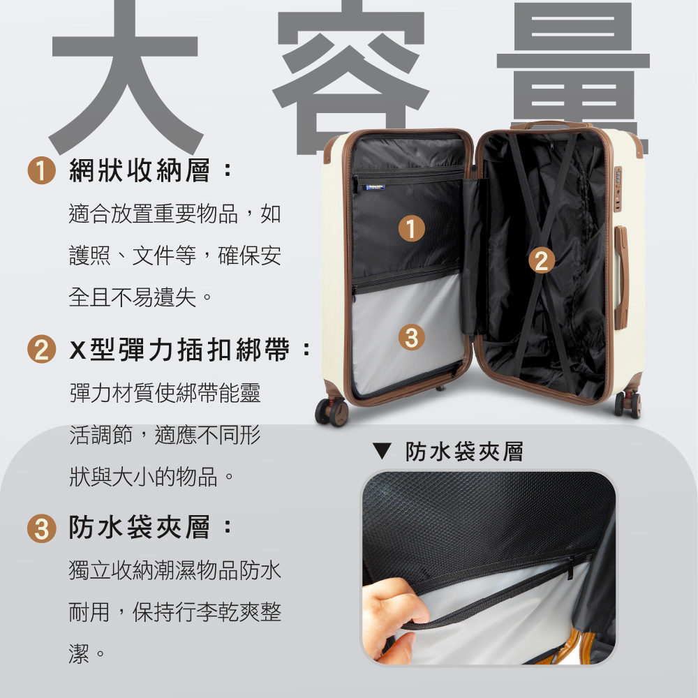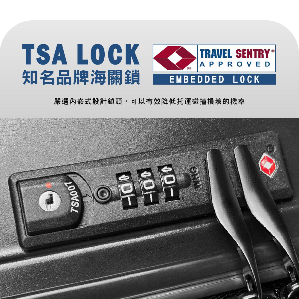 PN8 鎖頭 : 設有內嵌式TSA國際海關密碼鎖,前往歐美國家旅遊,安檢輕鬆又快速