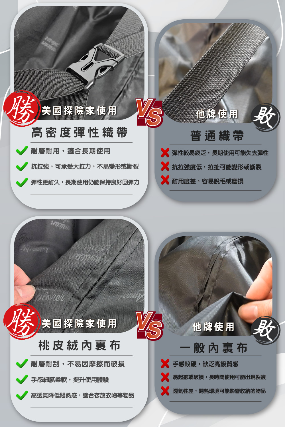 ● 內部左側設有網狀收納隔板,右側設有X型綁帶,可簡單固定行李,不易滑動