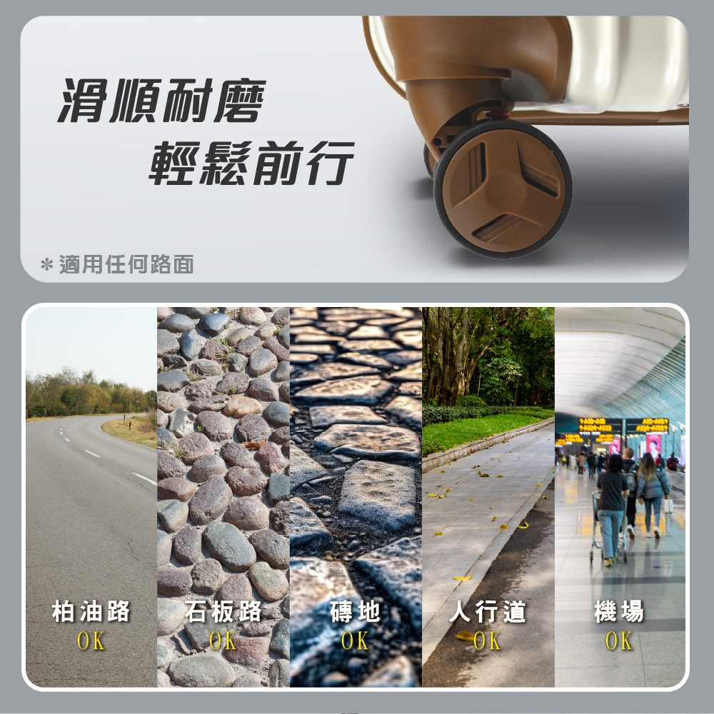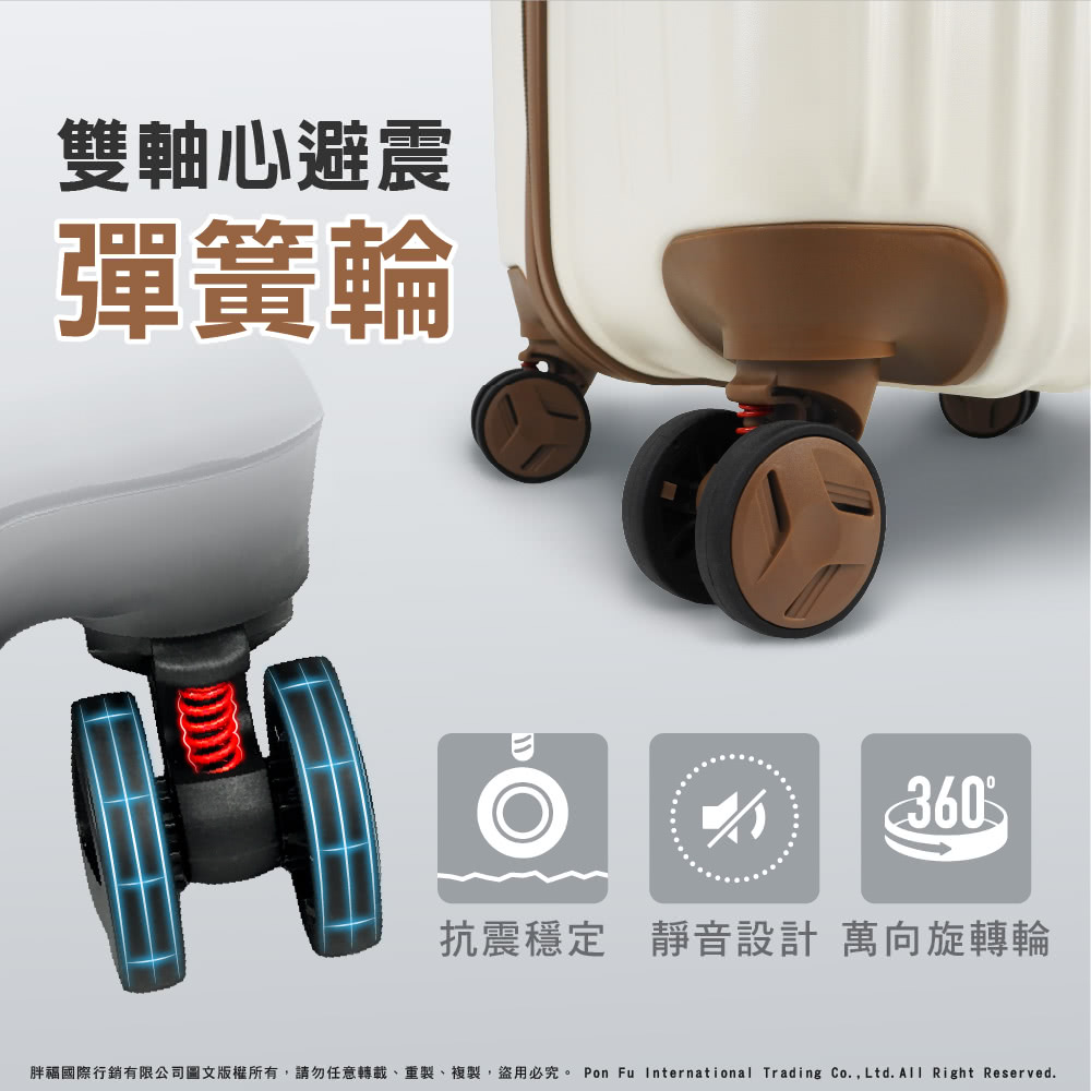 PN8 輪子 : 採用雙軸心避震彈簧輪,有效抗震,雙排飛機靜音大輪組,穩定滑順、耐磨好推拉,可360度萬向旋轉,適用各種地形