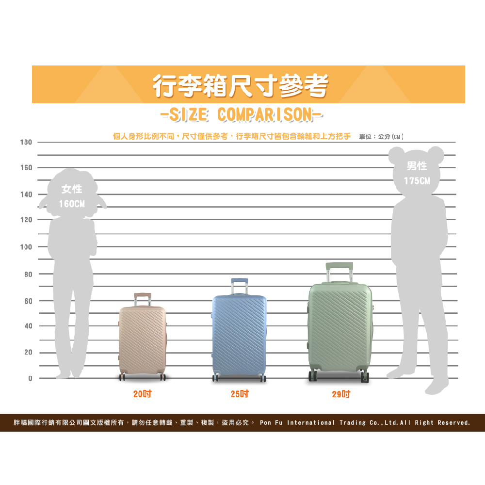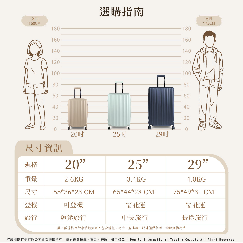 25吋:約為 28 x 44 x 65 cm (含輪)、重量約為 3.2 kg