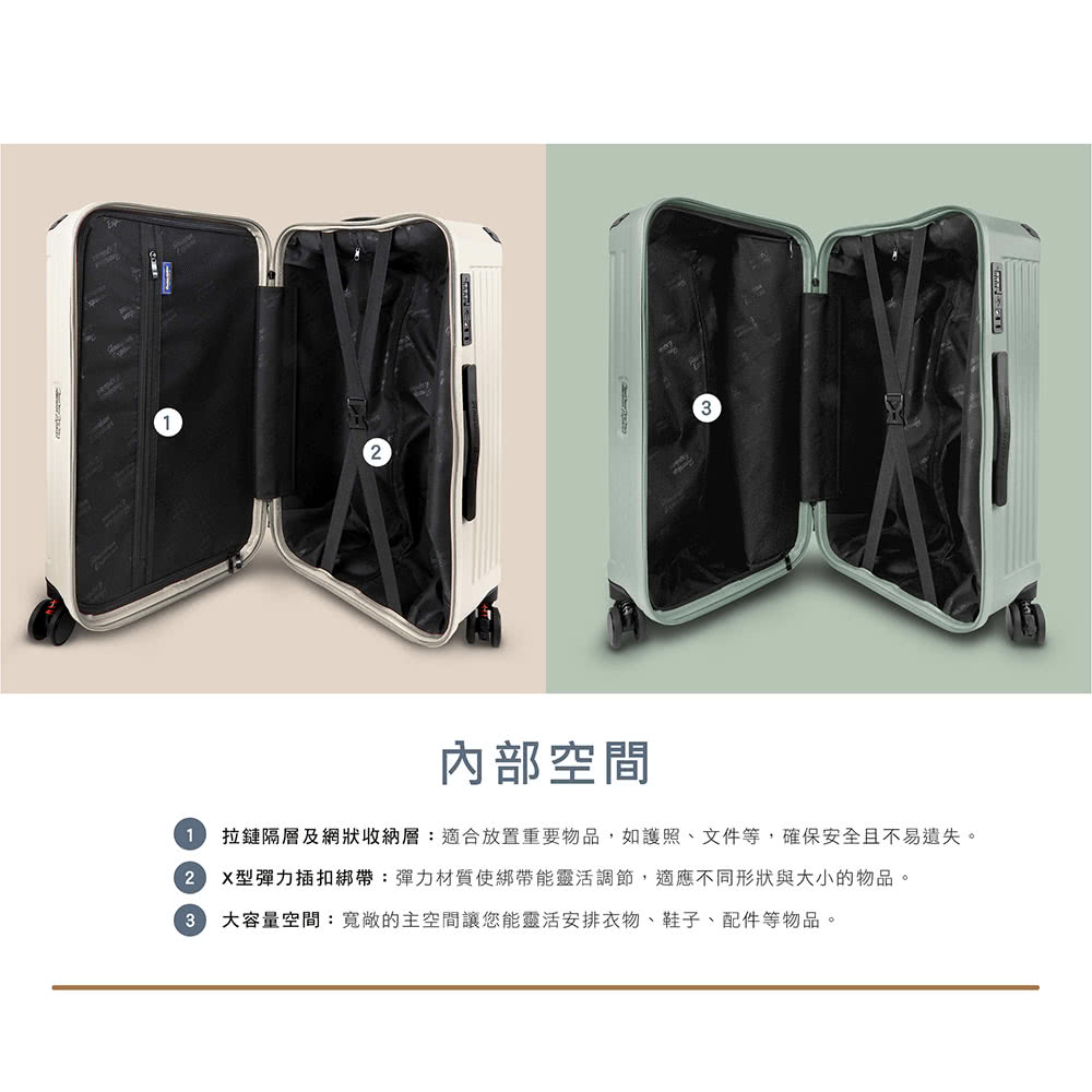 ● 內裏右側採用X型彈性插扣綁帶,可簡單固定您的行李;左側有一網狀拉鏈隔層,可收納您的隨身小物