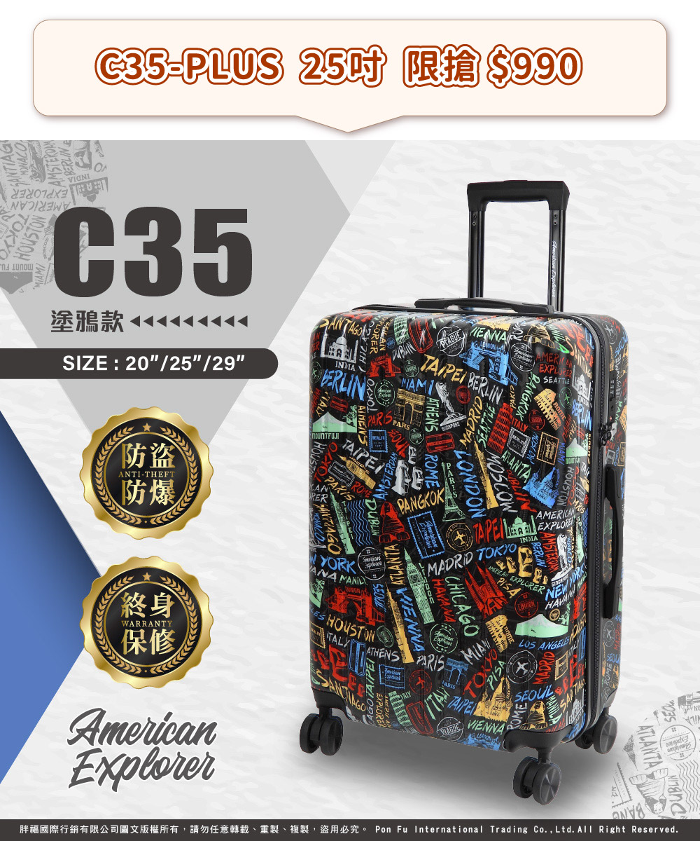 C35-PLUS 拉鍊 : 使用高品質雙層防盜/防爆拉鏈,比一般使用的拉鏈更堅固耐用,讓你輕鬆應對旅行的各種挑戰
