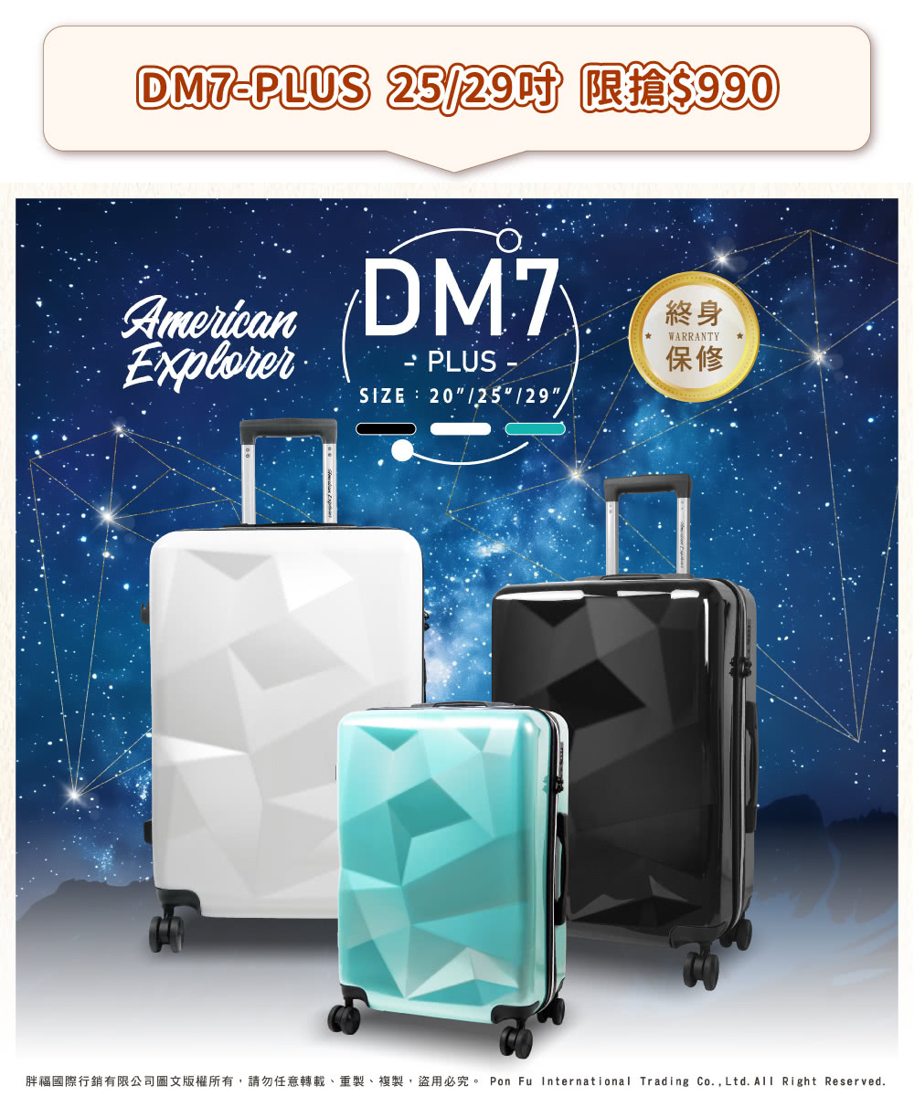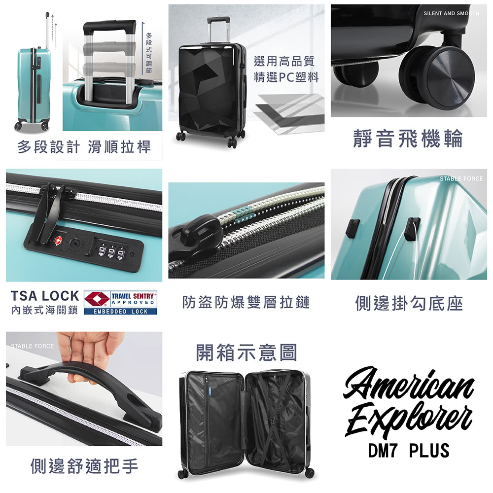 DM7-PLUS 鎖頭 : 設有內嵌式TSA國際海關密碼鎖,前往歐美國家旅遊,輕鬆過安檢、快速又放心