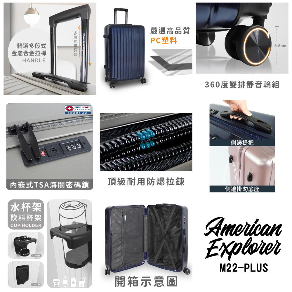 M22-PLUS 鎖頭 : 設有內嵌式TSA國際海關密碼鎖,內嵌式TSA鎖可有效降低託運損壞機率,前往歐美國家旅遊,輕鬆過安檢、快速又放心