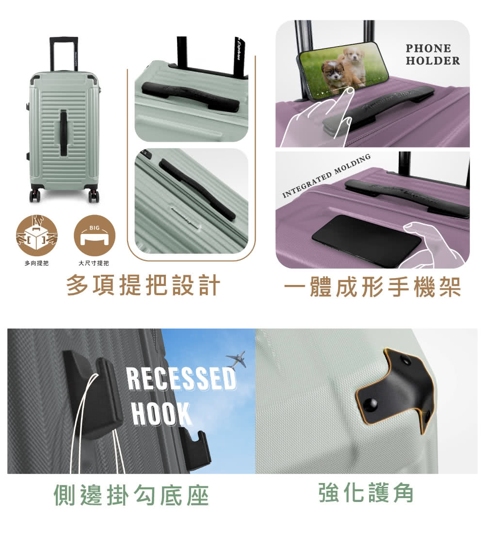 ● 附掛勾側邊底座設計,避免愛箱直接與地面接觸造成磨損,上方底座可掛置隨身物品,方便好拿取(下方底座為一般底座)