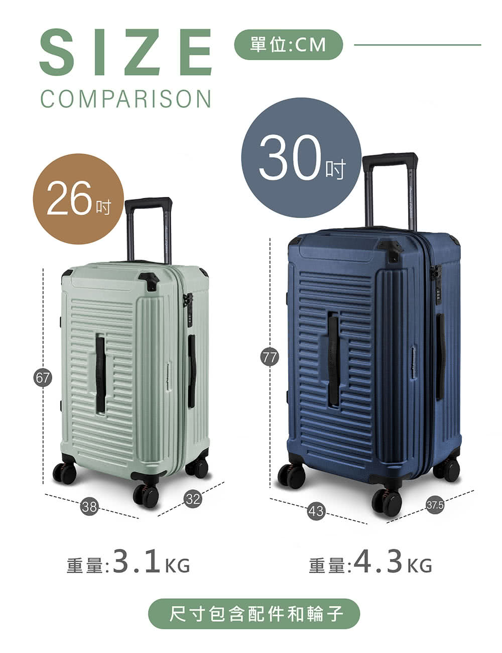 30吋:約為 37.5 x 43 x 77 cm (含輪)、重量約為 4.3 kg