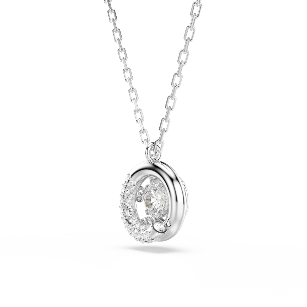 這款迷人的 Dextera 鏈墜展現了律動之美。鍍銠設計懸掛在帶龍蝦扣的精緻鏈條上,中央有一圓環,密鑲半圈透明 Swarovski 水晶,中間鑲嵌一顆漂浮舞動的 Swarovski 鋯石。搭配一組成套的耳環,打造出歡樂奢華的風格。